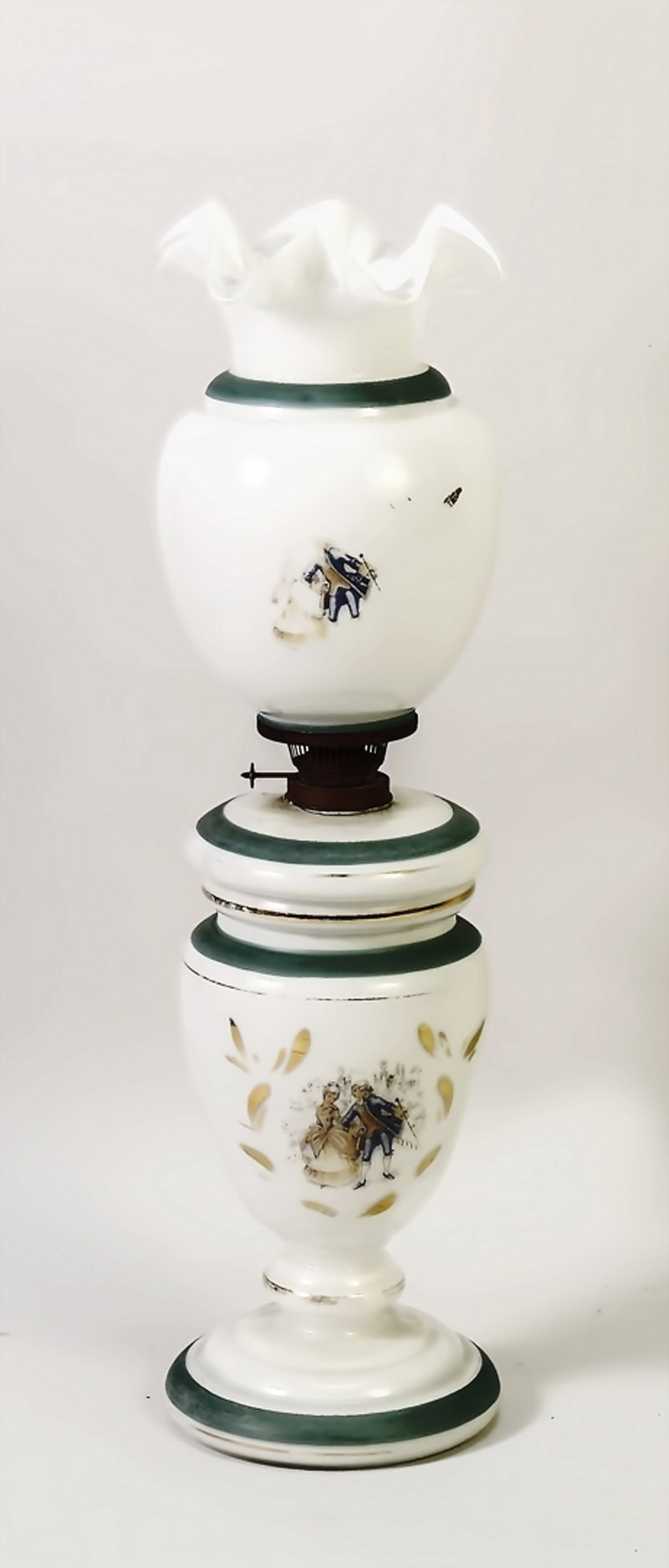 LAMPADA AD OLIO IN OPALINE - OPALIN OIL LAMP decorata con scene galanti in stile settecentesco, montata a lume, difetti alla decorazione h cm 54