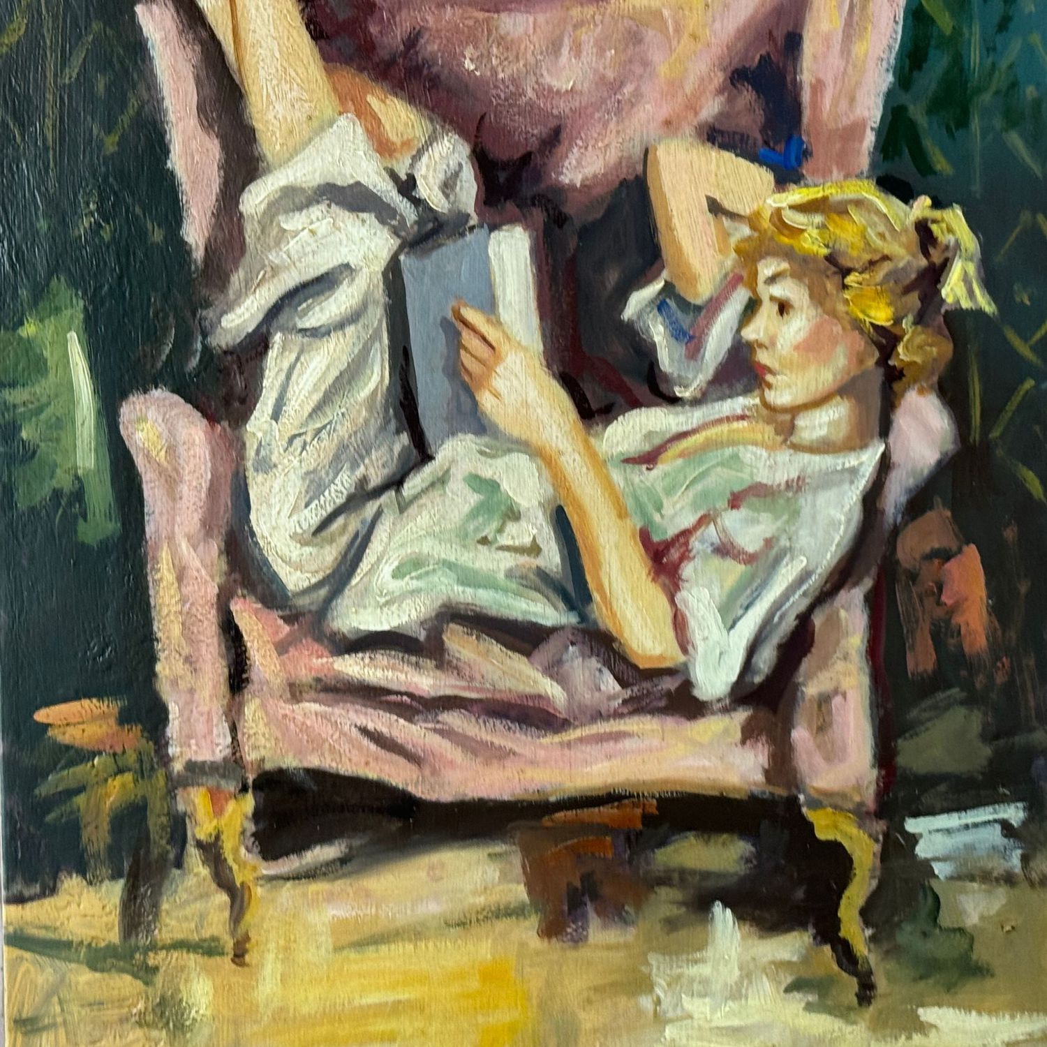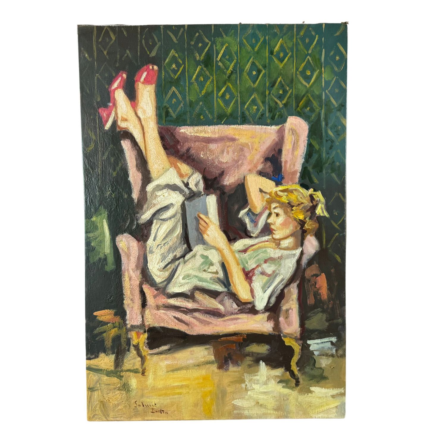 Dipinto olio su tela, periodo XX secolo scuola Italiana, raffigurante Donna in lettura. Dimensioni: 40x60 cm. Reca firma in basso a sinistra di difficile lettura. Opera in buone condizioni.