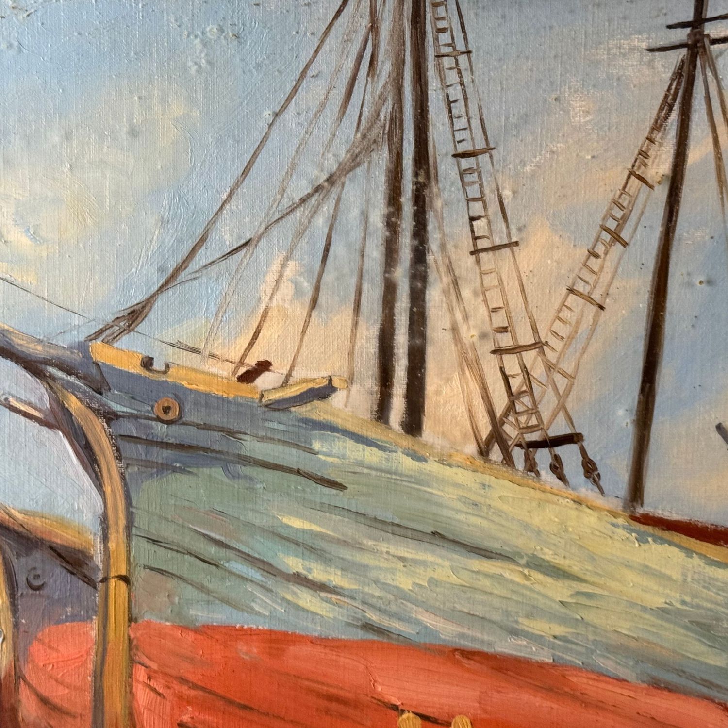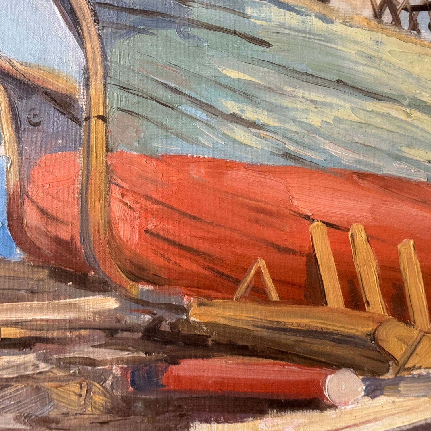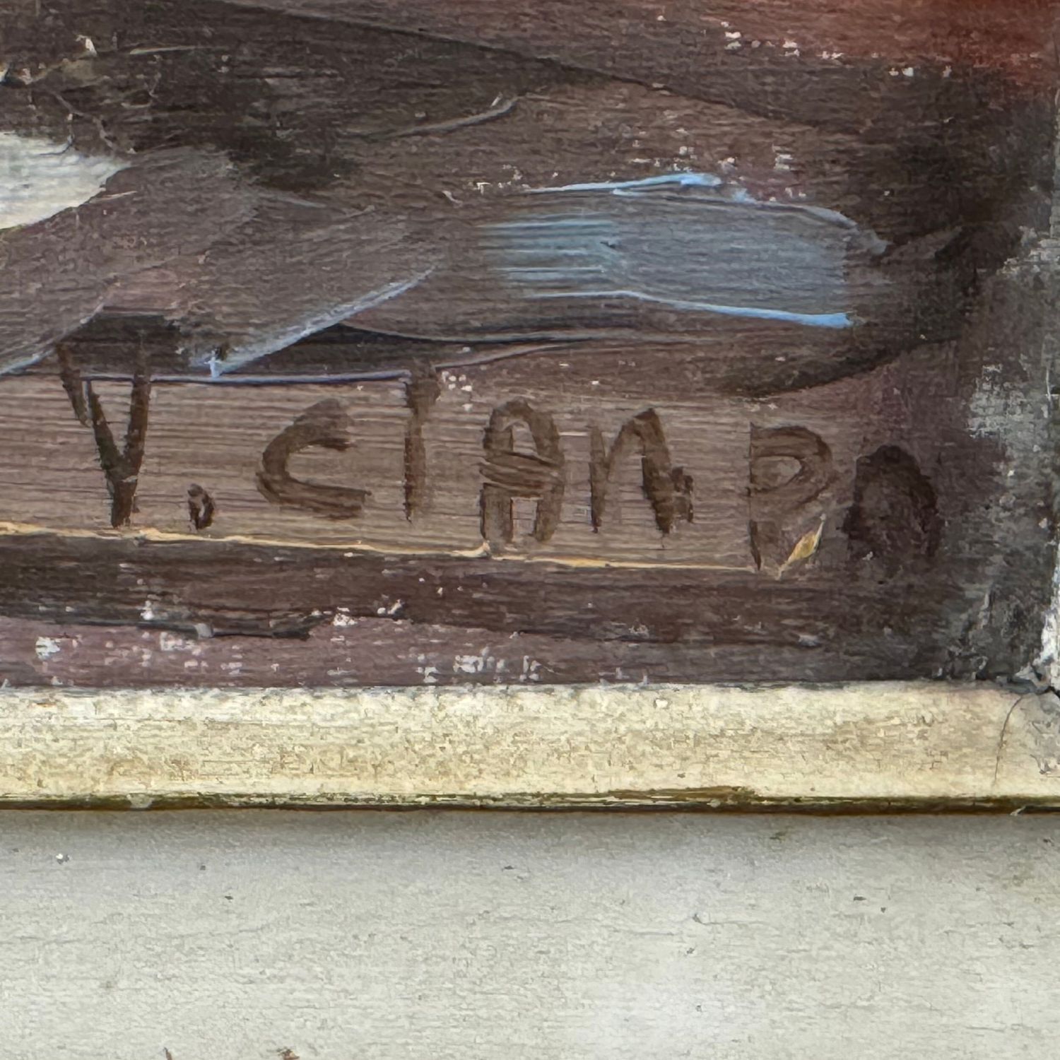 Dipinto olio su tela applicata su pannello, periodo XX secolo scuola Italiana, raffigurante Barche a secco. Dimensioni interno cornice: 40x50 cm. Dimensioni compreso cornice: 69x59 cm. Reca firma in basso a destra V. Ciampa. Opera in buone condizioni. Cornice da restaurare.