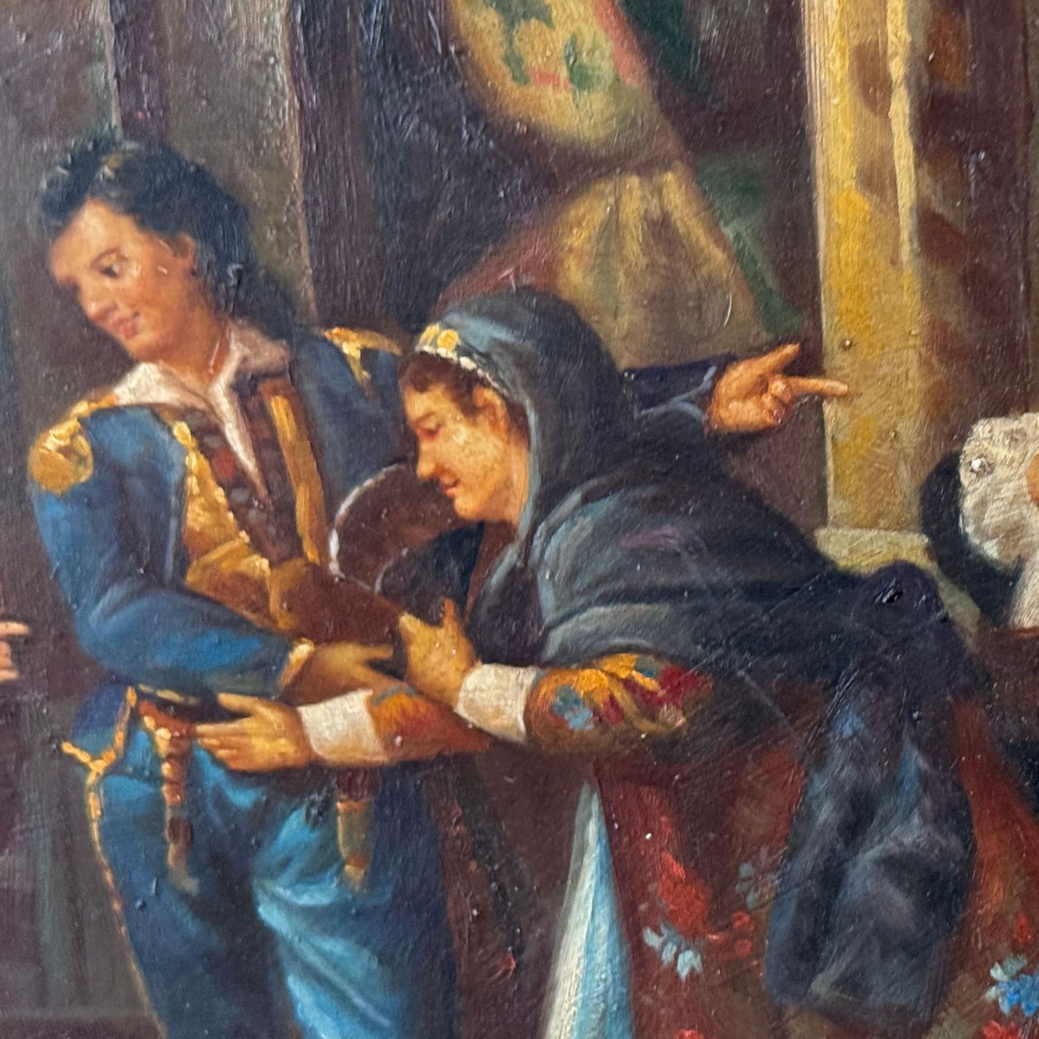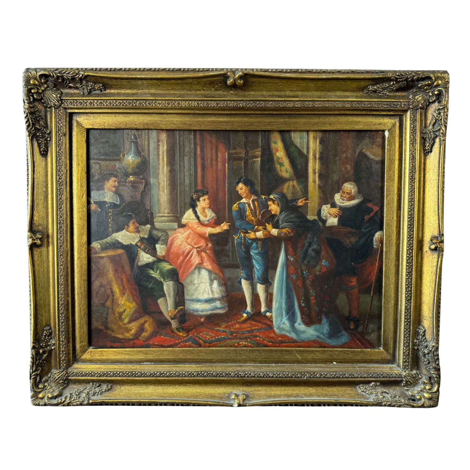 Dipinto olio su tavola, periodo XX secolo scuola Italiana, raffigurante Scena di corte con personaggi. Dimensioni interno cornice: 40x30 cm. Dimensioni compreso cornice: 54x44 cm. Da artista anonimo. Opera in buone condizioni.