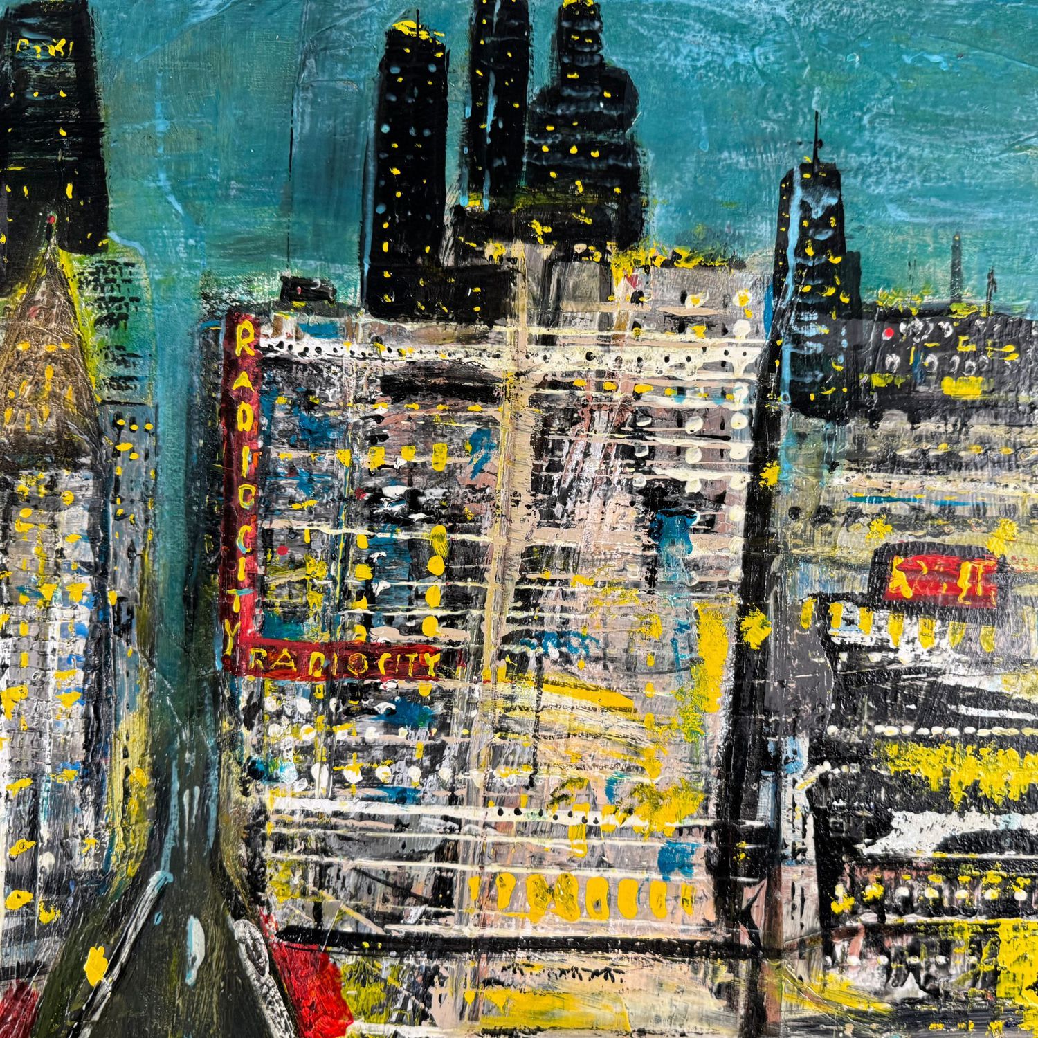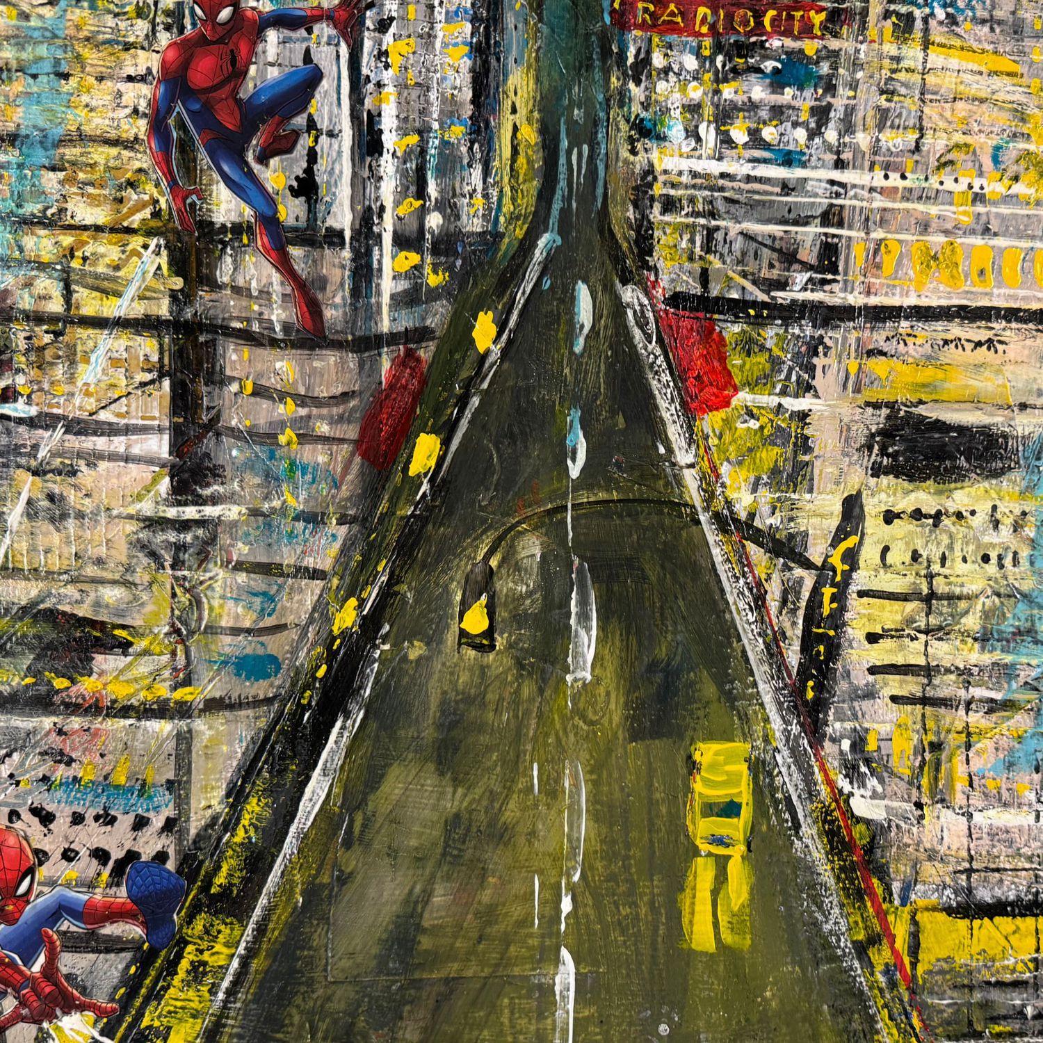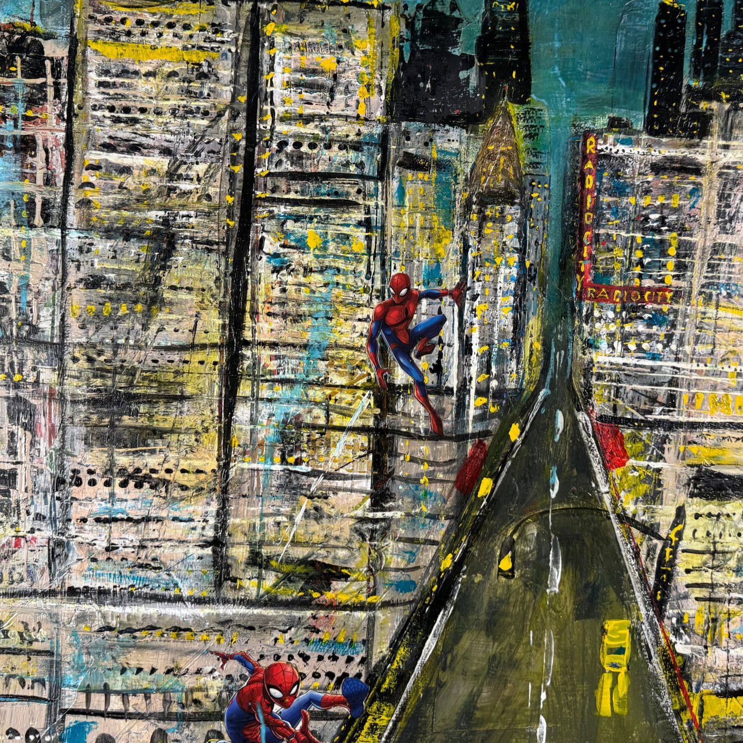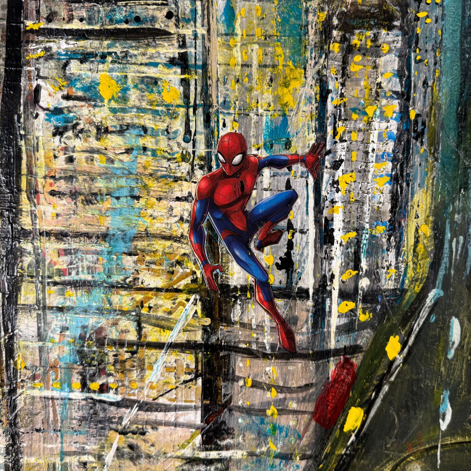 Dipinto acrilico e collage su tavola, raffigurante Spiderman. Dimensioni: 90x90 cm. Reca firma in basso a sinistra di difficile lettura.