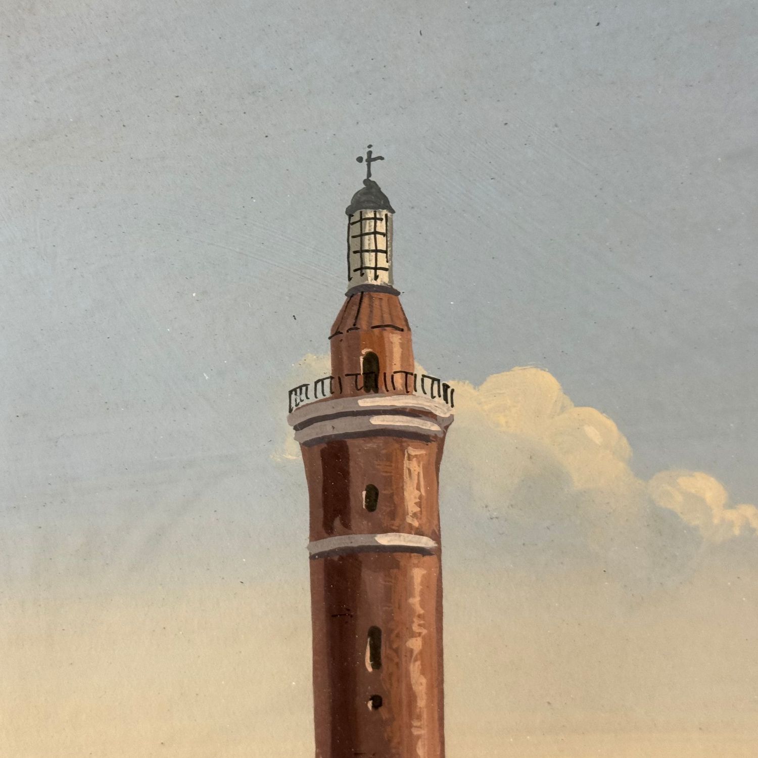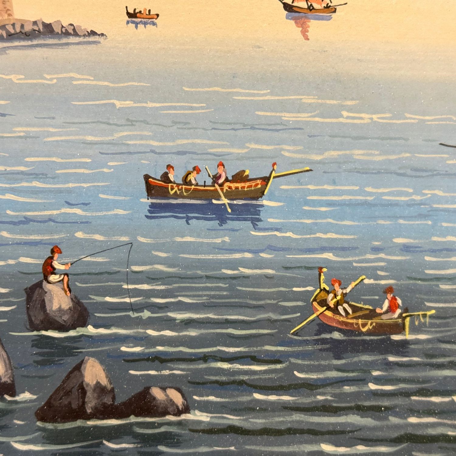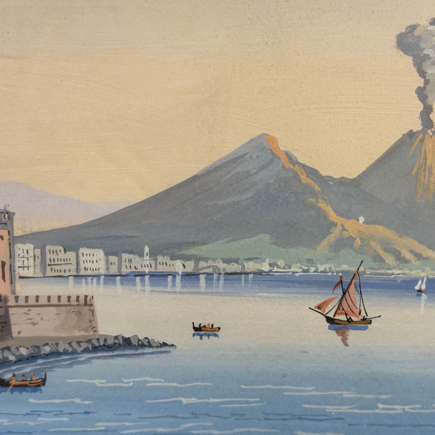 Dipinto guazzo (tempera su carta), periodo XX secolo scuola Italiana, raffigurante Veduta del faro e del Vesuvio a Napoli. Dimensioni interno cornice: 60x50 cm. Dimensioni compreso cornice: 74x64 cm. Da artista anonimo. Opera in buone condizioni.