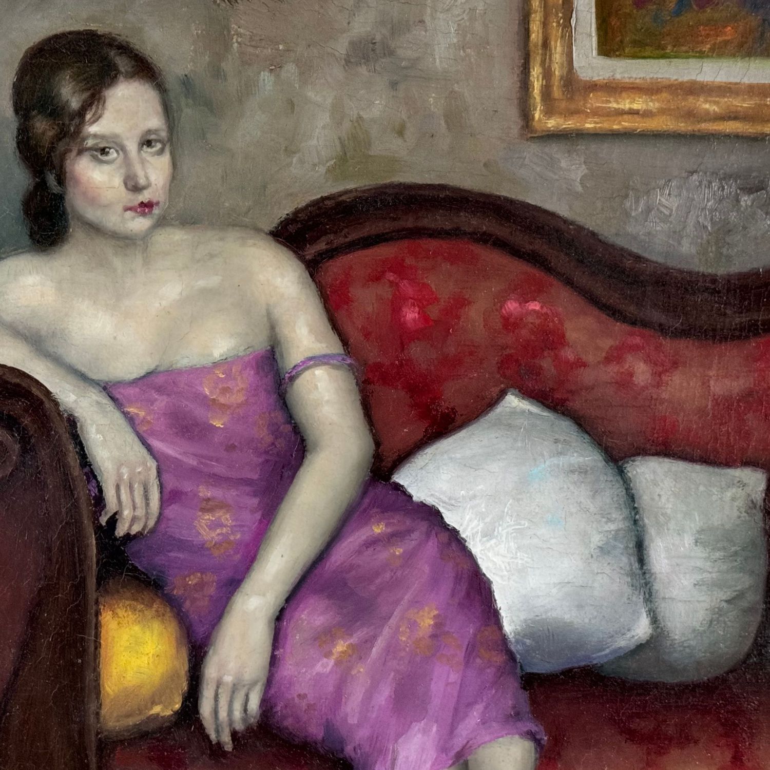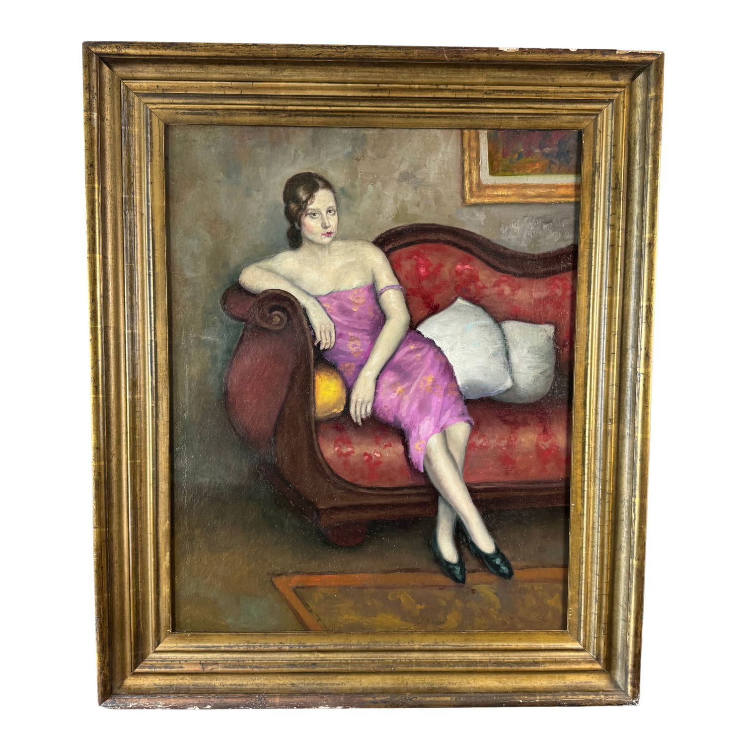 Dipinto olio su tela, periodo XX secolo scuola Italiana, raffigurante Ritratto di donna su divano. Dimensioni interno cornice: 58x72 cm. Dimensioni compreso cornice: 76x90 cm. Da artista anonimo. Opera in buone condizioni con lievi segni di vissuto come da foto allegate.
