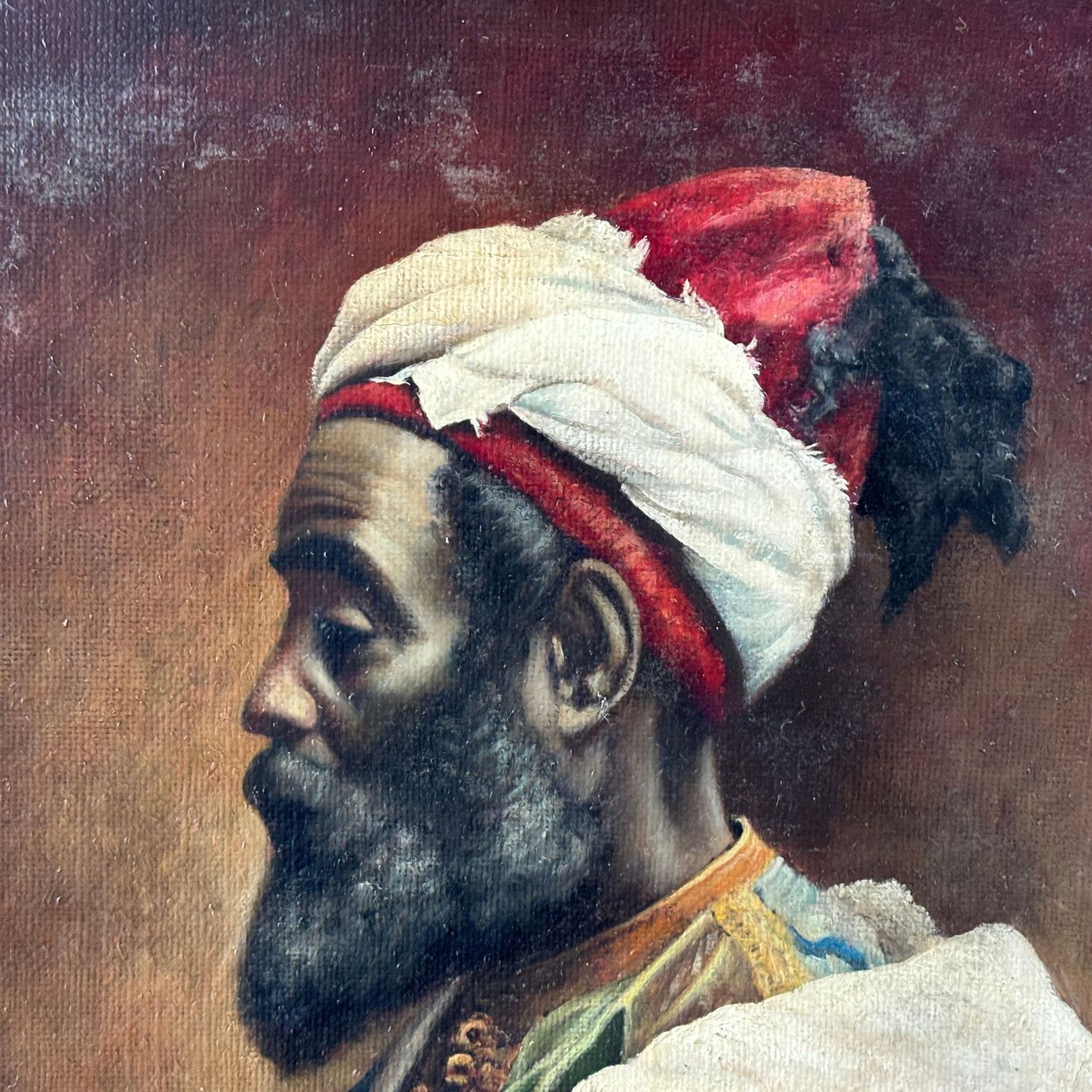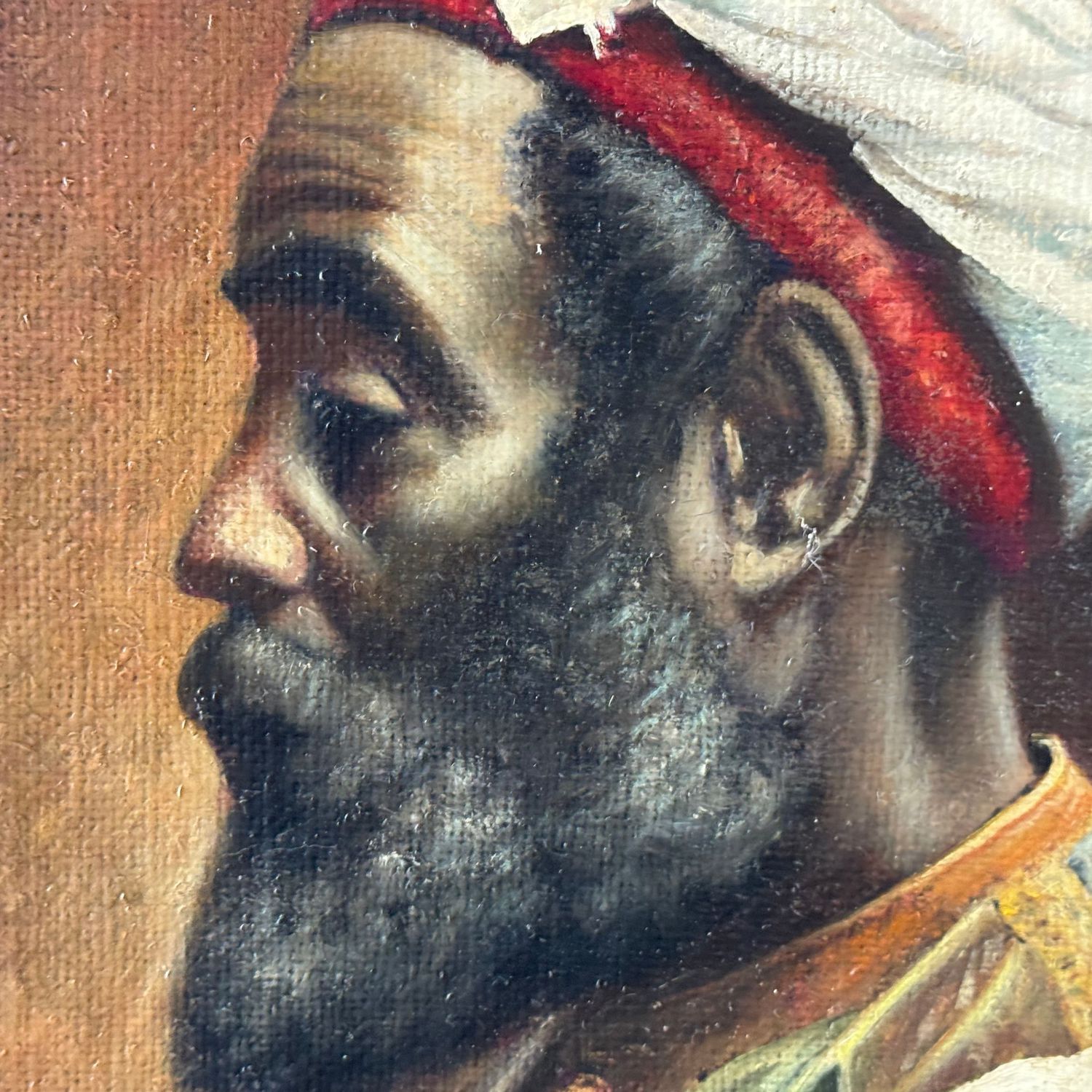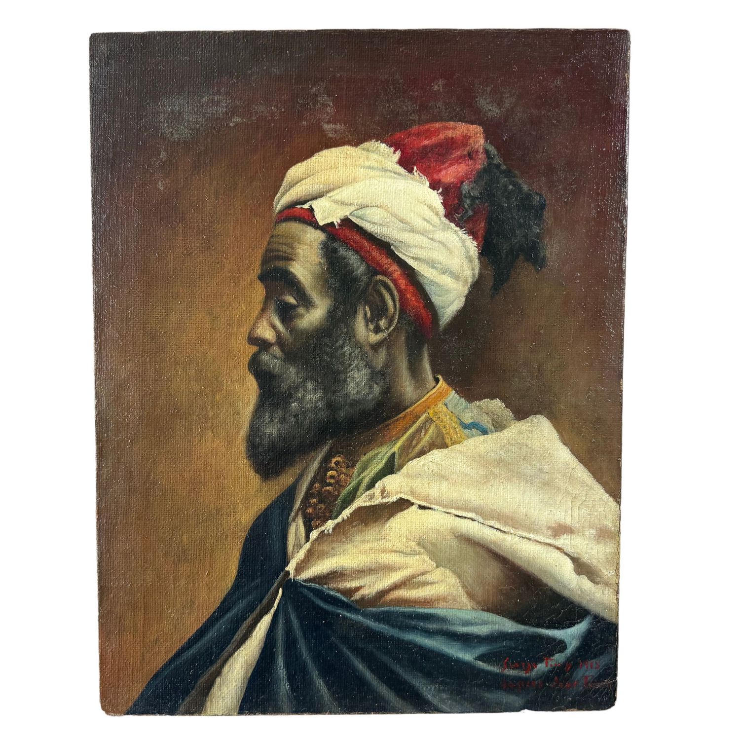 Dipinto olio su tela, periodo XX secolo scuola italiana, raffigurante Uomo con turbante. Dimensioni: 41x53 cm. Reca firma in basso a destra di difficile lettura. Copia da Josep Tapiró Baró. Opera in buone condizioni.