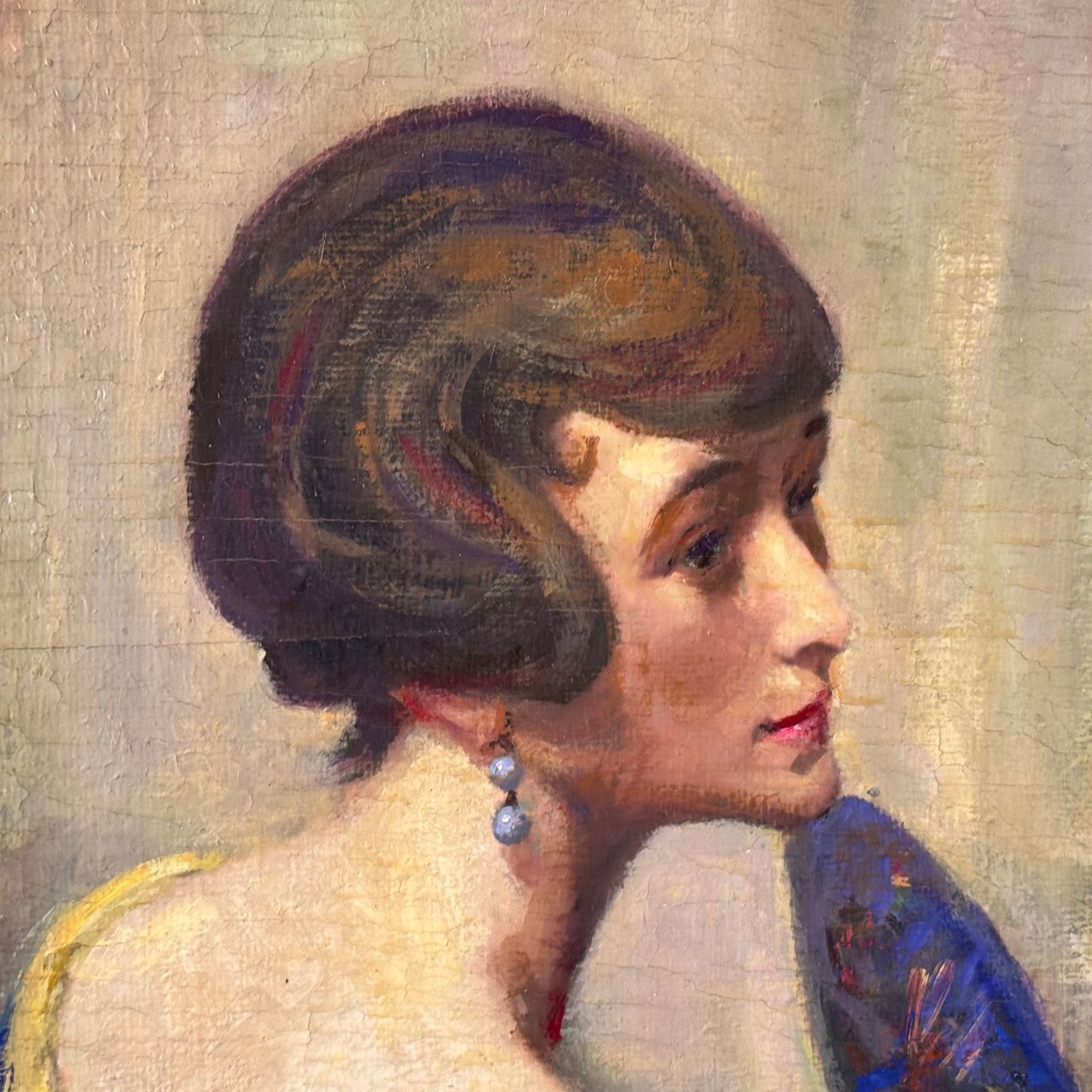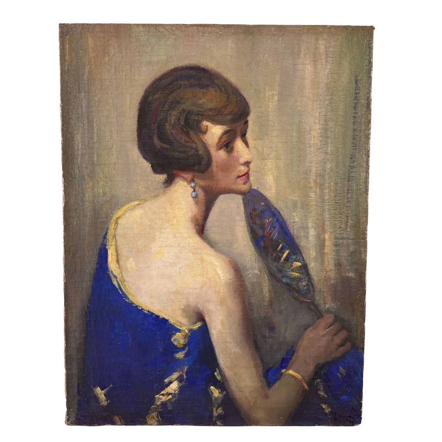 Dipinto olio su tela, periodo XX secolo scuola italiana, raffigurante Donna con ventaglio. Dimensioni: 43x57 cm. Reca firma in basso a destra di difficile lettura. Opera in buone condizioni con lievi segni di vissuto come da foto allegate.