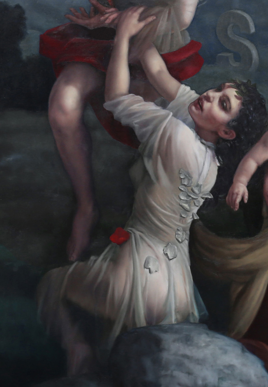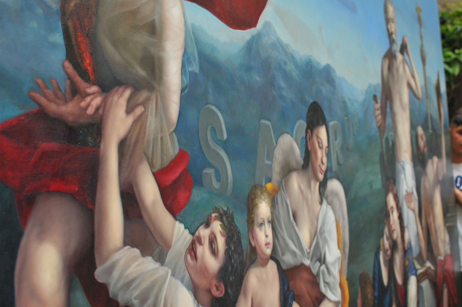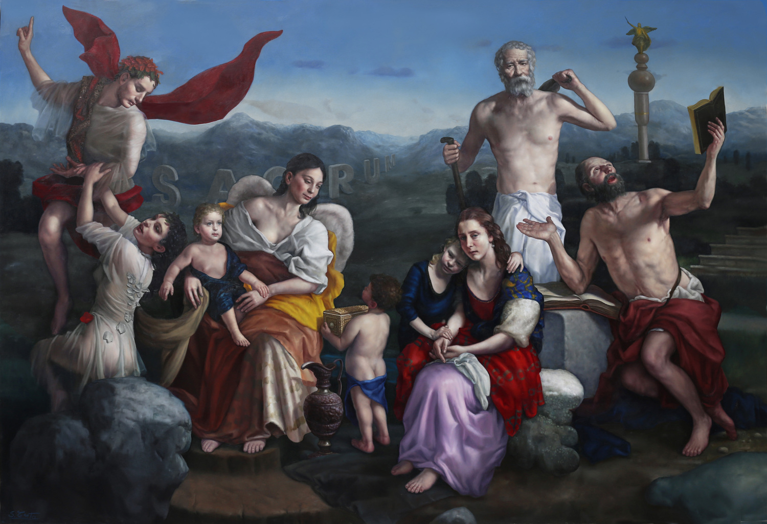 Sono presenti mistici dotti con i loro libri sacri; sulla sinistra due figure uniscono terra a cielo, con un mantello che fa pensare sapientemente a due ali di angelo....Al centro una donna con una bambina osservano l'osservatore con intensa espressione, a voler comunicare la propria storia travagliata.Mentre la donna a sinistra sorride a un bambino che gli consegna un piccolo grande tesoro.E' il tesoro della nuova era che come disse un grande teologo " o sarà mistica o non sarà". Sullo sfondo della scena, si staglia nella vallata una scritta di pietra "SACRUM" e se ne va verso 'orizzonte. A vedere le cose belle e fatte sembra tutto facile, ma in realtà non so quel artista avrebbe avuto il fegato di inserire in quadro di grandi dimensioni, una scritta.., senza farlo sembrare una insegna pubblicitaria: in quanto quello è il rischio quando si inseriscono lettere...Inoltre l'idea di allineare quella parola SACRUM in una prospettiva curvata, è oltremodo considerevole.Non è assolutamente da tutti.