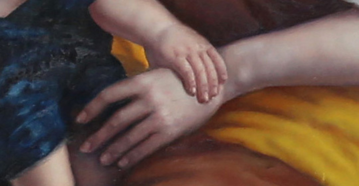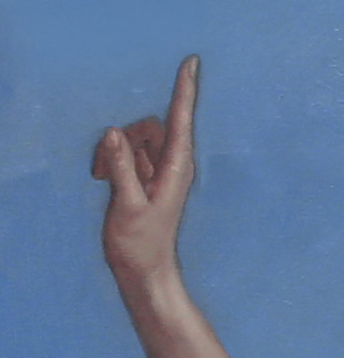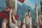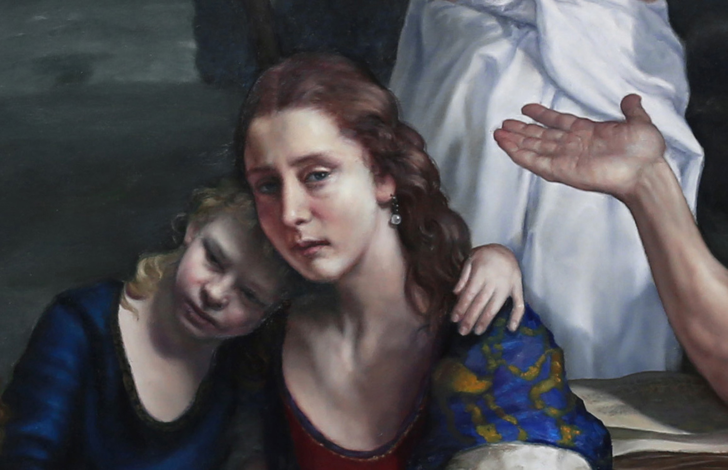 Sono presenti mistici dotti con i loro libri sacri; sulla sinistra due figure uniscono terra a cielo, con un mantello che fa pensare sapientemente a due ali di angelo....Al centro una donna con una bambina osservano l'osservatore con intensa espressione, a voler comunicare la propria storia travagliata.Mentre la donna a sinistra sorride a un bambino che gli consegna un piccolo grande tesoro.E' il tesoro della nuova era che come disse un grande teologo " o sarà mistica o non sarà". Sullo sfondo della scena, si staglia nella vallata una scritta di pietra "SACRUM" e se ne va verso 'orizzonte. A vedere le cose belle e fatte sembra tutto facile, ma in realtà non so quel artista avrebbe avuto il fegato di inserire in quadro di grandi dimensioni, una scritta.., senza farlo sembrare una insegna pubblicitaria: in quanto quello è il rischio quando si inseriscono lettere...Inoltre l'idea di allineare quella parola SACRUM in una prospettiva curvata, è oltremodo considerevole.Non è assolutamente da tutti.