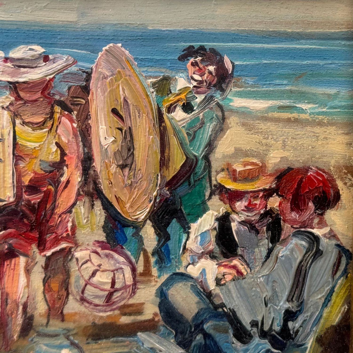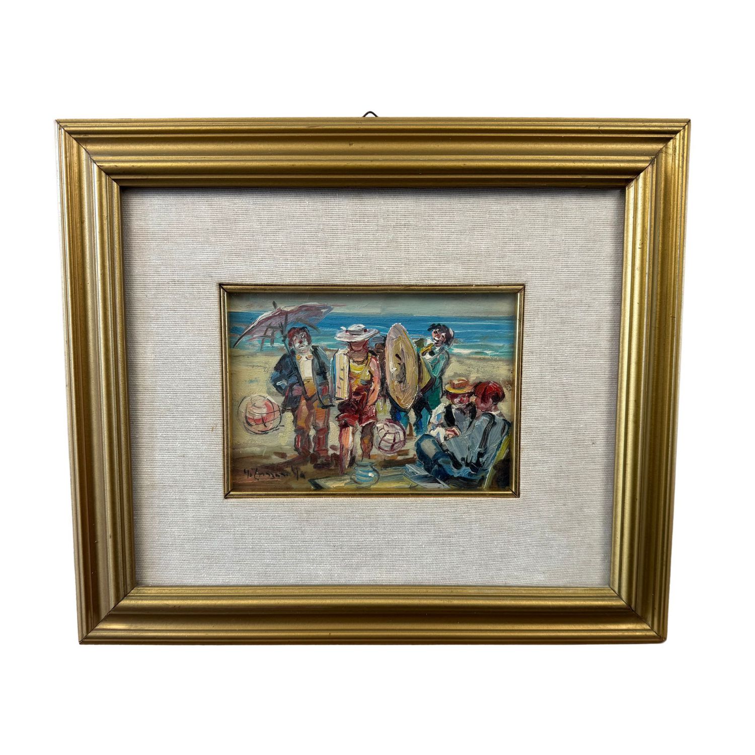 Dipinto olio su tavola, periodo XX secolo scuola Italiana, raffigurante Personaggi circensi su marina.
