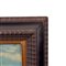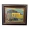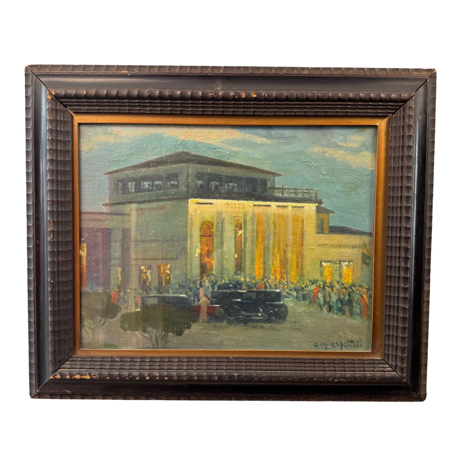 Dipinto olio su tela applicata su cartoncino, periodo XX secolo, raffigurante Personaggi con edificio ed auto d'epoca.