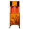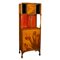 Vetrina in noce modellata e intagliata, nella parte superiore un ripiano aperto sormontato da un’antina intarsiata con un paesaggio lacustre, affiancata su entrambi i lati da due piccole nicchie, sostenute da tre colonne modanate e intagliate, le due laterali ritorte, quella centrale decorata con un motivo floreale in rilievo. La parte inferiore si apre su un’ampia anta intarsiata con iris selvatici, la fascia modellata con motivi floreali in rilievo poggia su quattro piedi con bulbi scanalati.