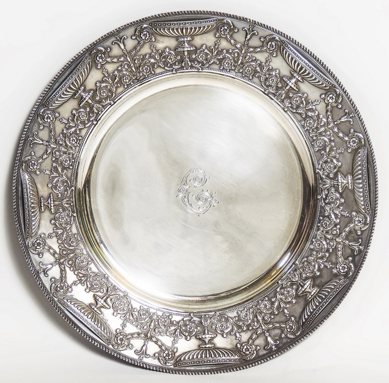 PIATTO IN ARGENTO STERLING - STERLING SILVER PLATE New York, Tiffany & Co, 1901-1902 alta fascia sbalzata con teoria di vasi e ghirlande di gusto neoclassico, al centro inciso con iniziale C gr 775, diam cm 27,5 Marcati T. & Co 14763 Makers 3560 sterling silver