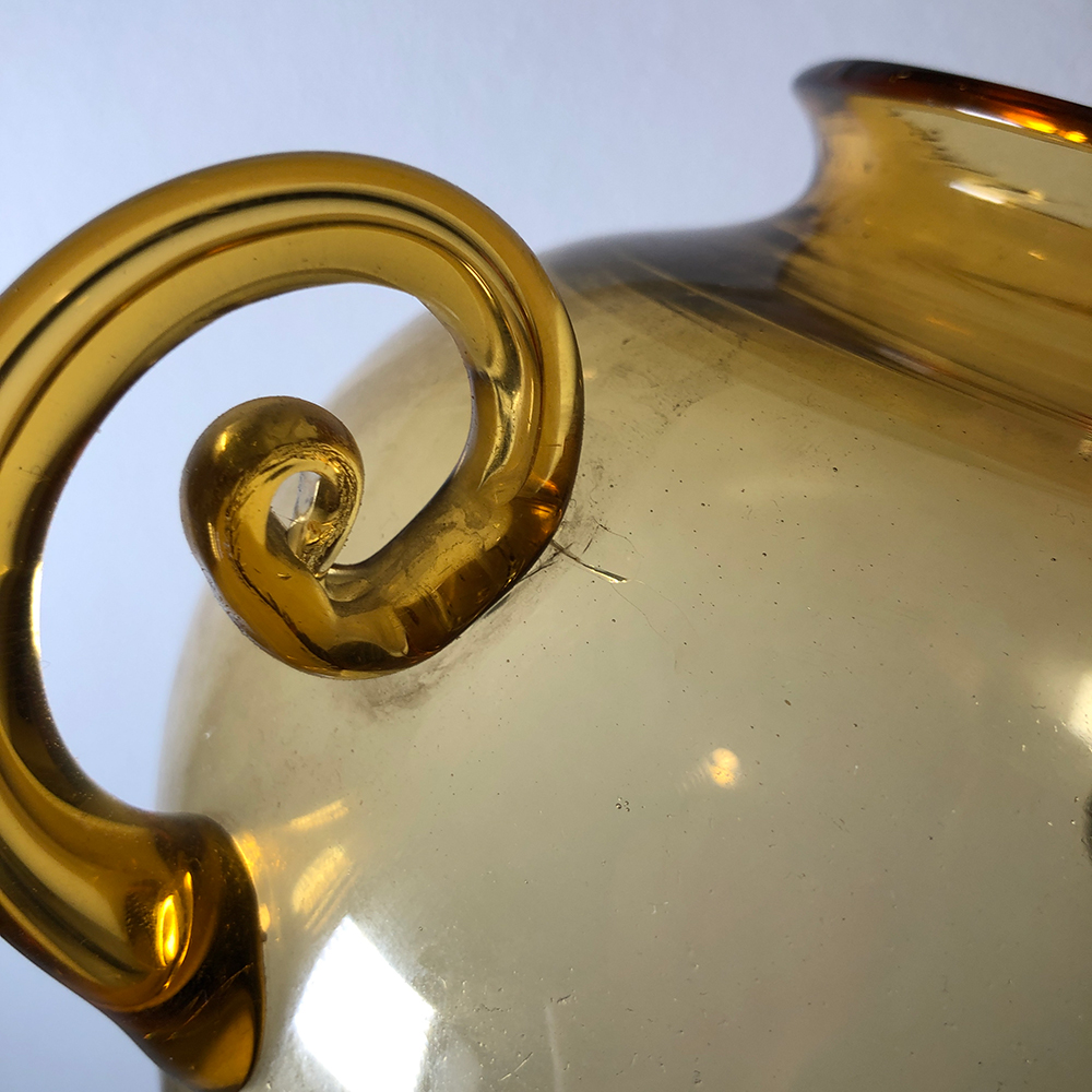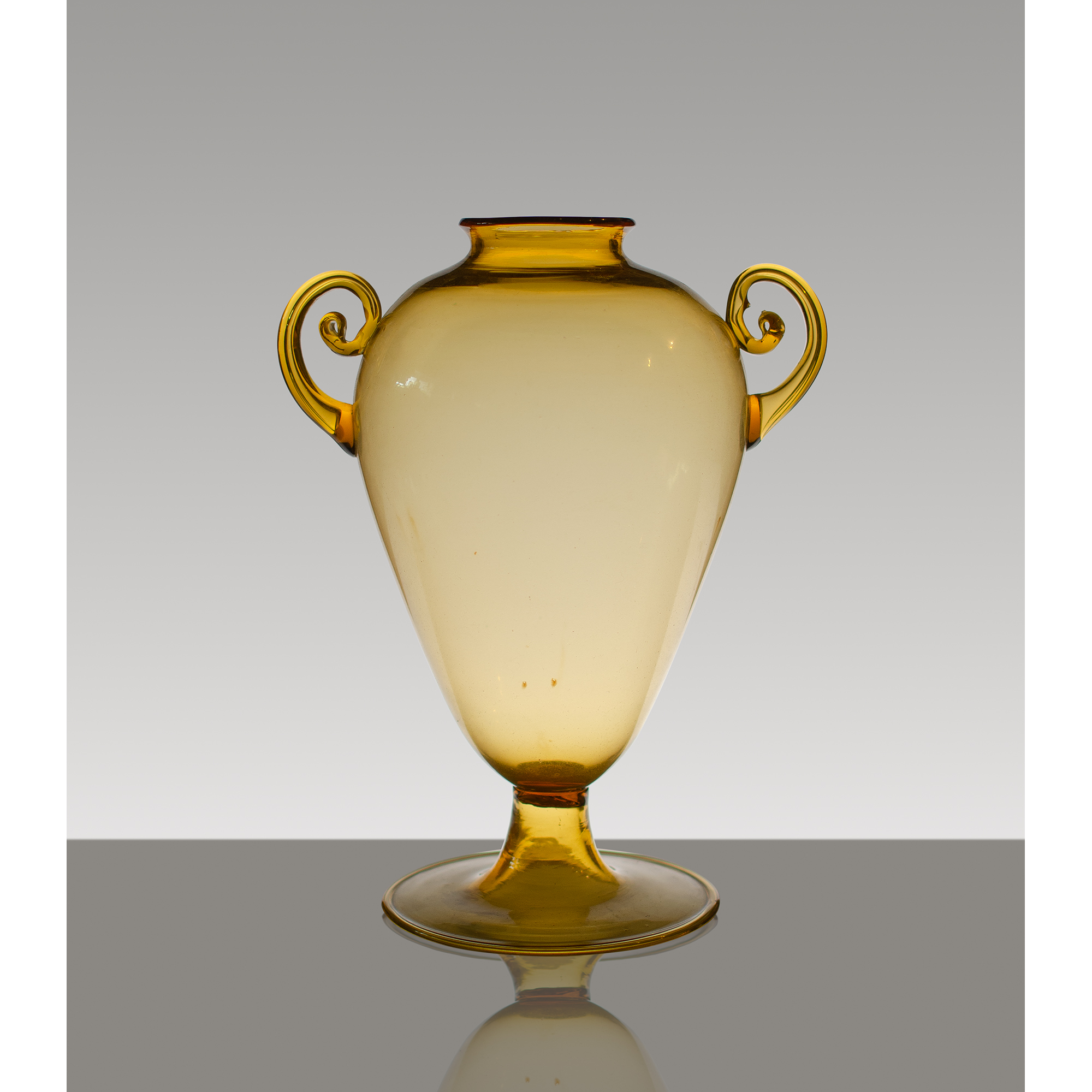 Vaso in vetro soffiato con anse applicate, 1921 - 1925 circa. Reca vecchia etichetta: Cappelllin Venini & C.