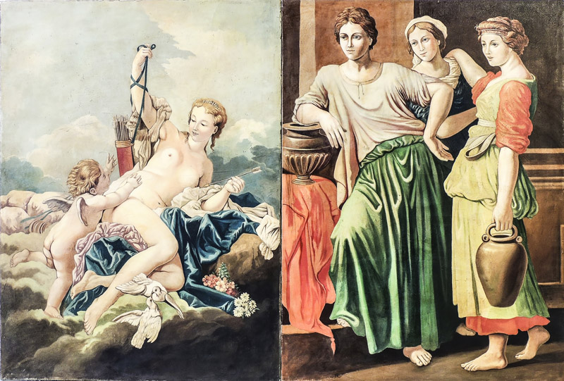 Figure Femminili con anfore - Female Figures with Amphoras Venere e Cupido - and Venus with Cupid due dipinti ad olio su tela - a pair of oils on canvas, lievi difetti cm 103x76