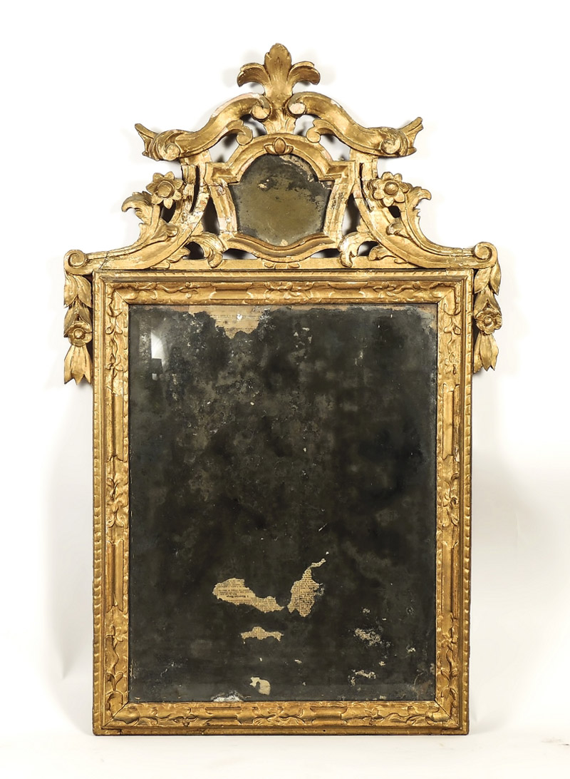 SPECCHIERA IN LEGNO DORATO - GILTWOOD MIRROR inizio del XX secolo - early 20th Century intagliata con motivi floreali e foglie d'acanto, difetti cm 113,5x70