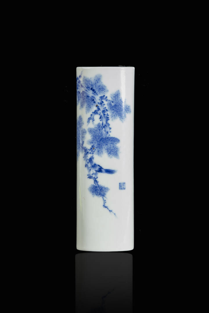 Fermacarte in porcellana bianca e blu, Cina, dinastia Qing, XIX sec.