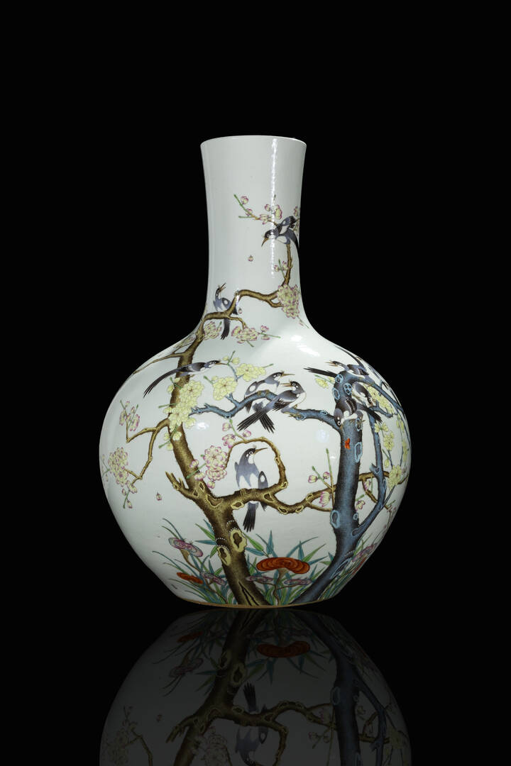 Grande vaso a pallone in porcellana dipinta con uccelli fra i rami, Cina, Repubblica, XX sec.