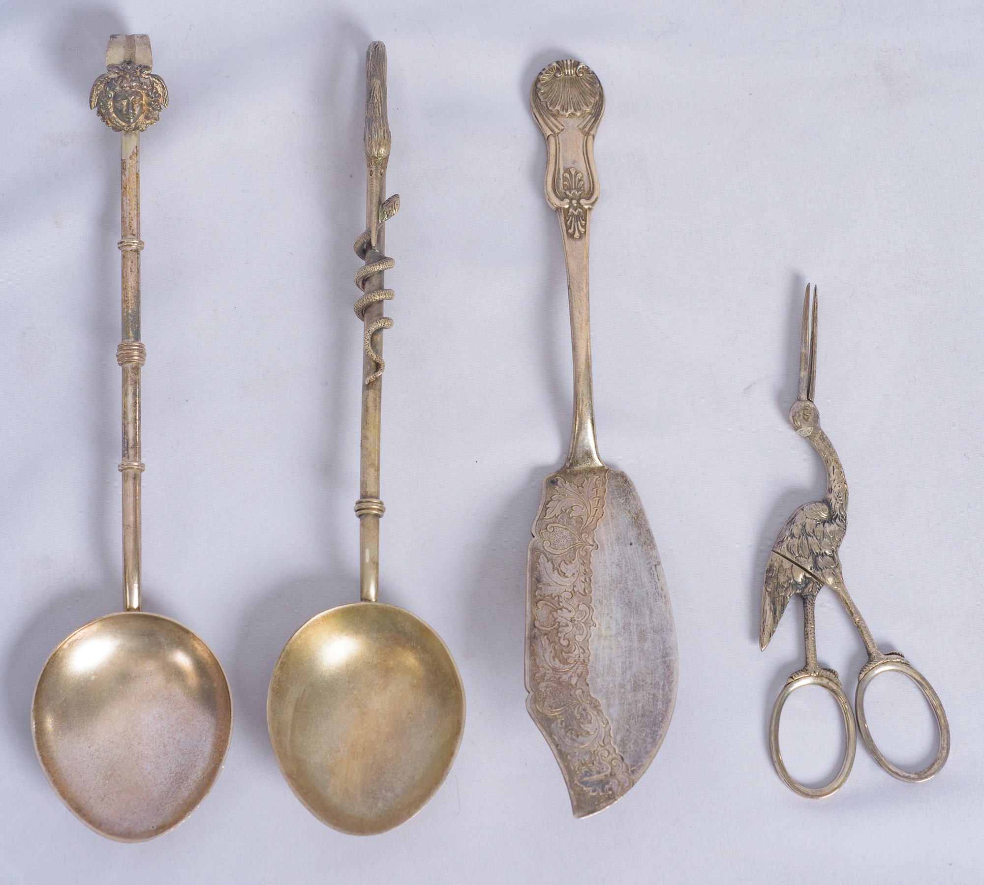 Due cucchiai , una forbice e coltello da pesce in argento 800 Manifattura...