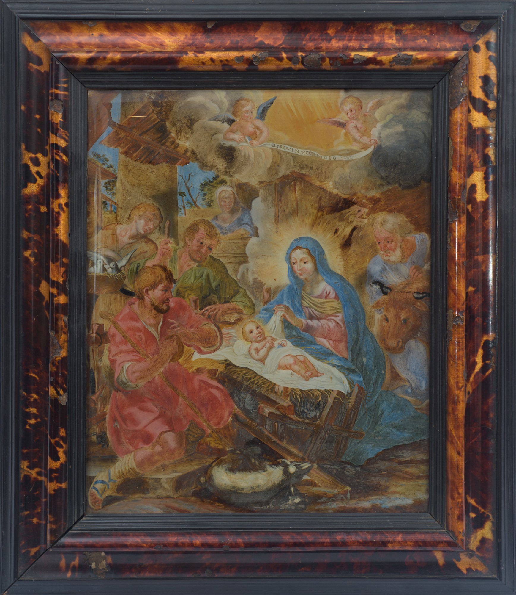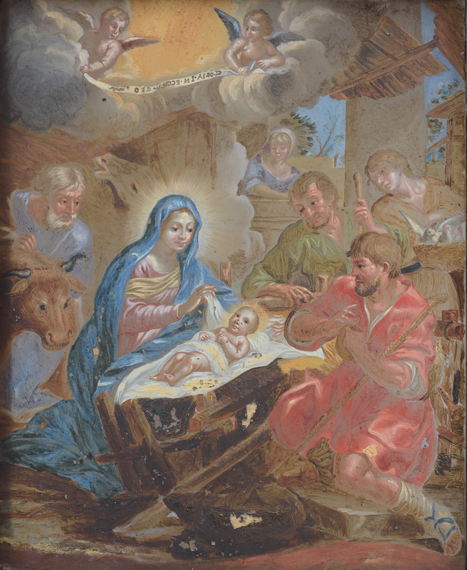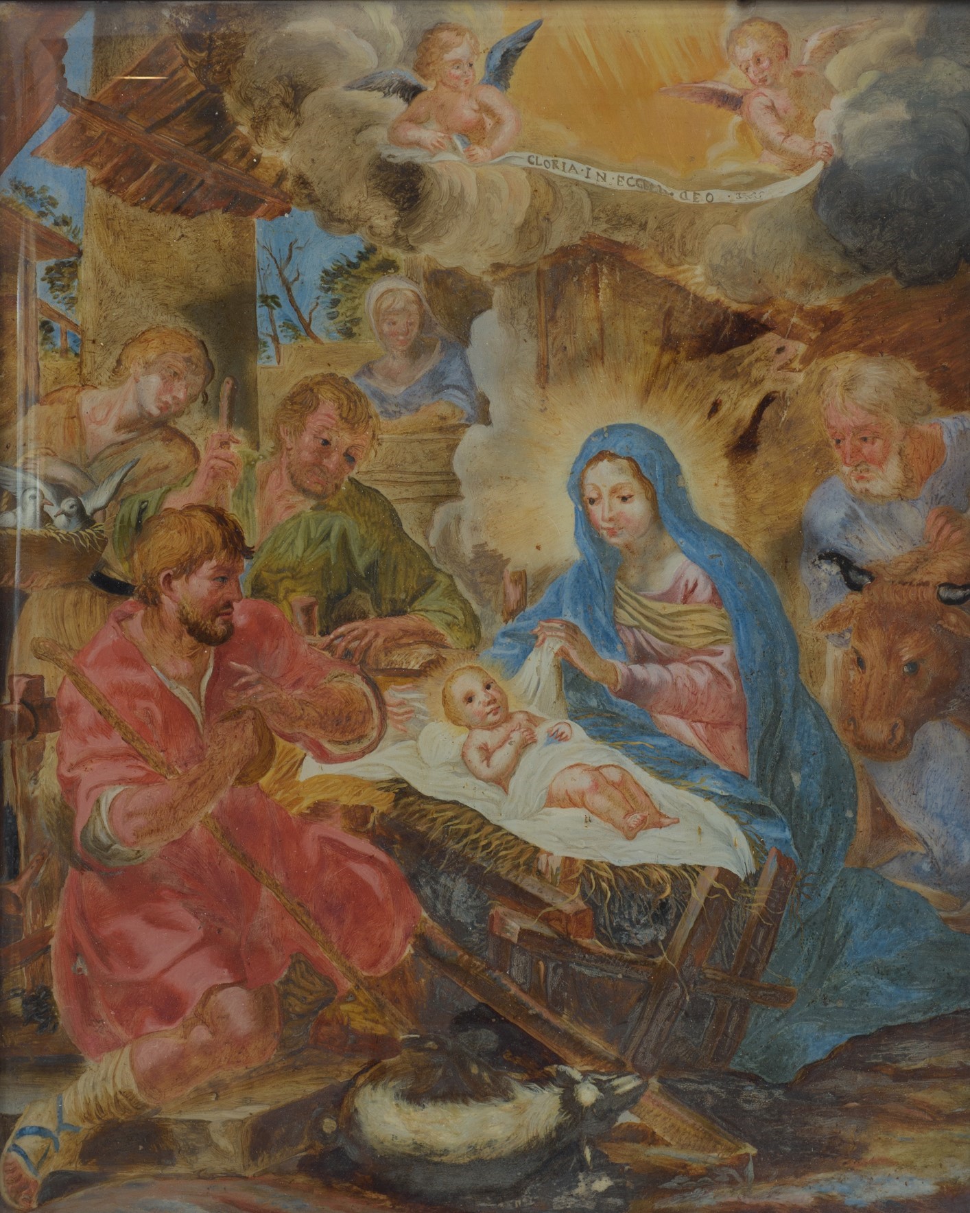 Adorazione dei pastori Scuola italiana XVIII secolo Olio su vetro 28,5 x 23,5 cm