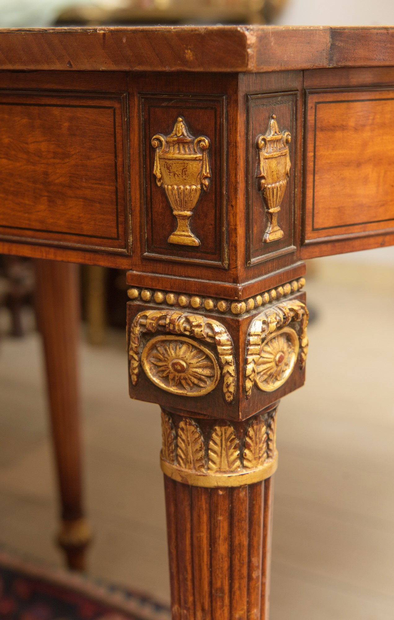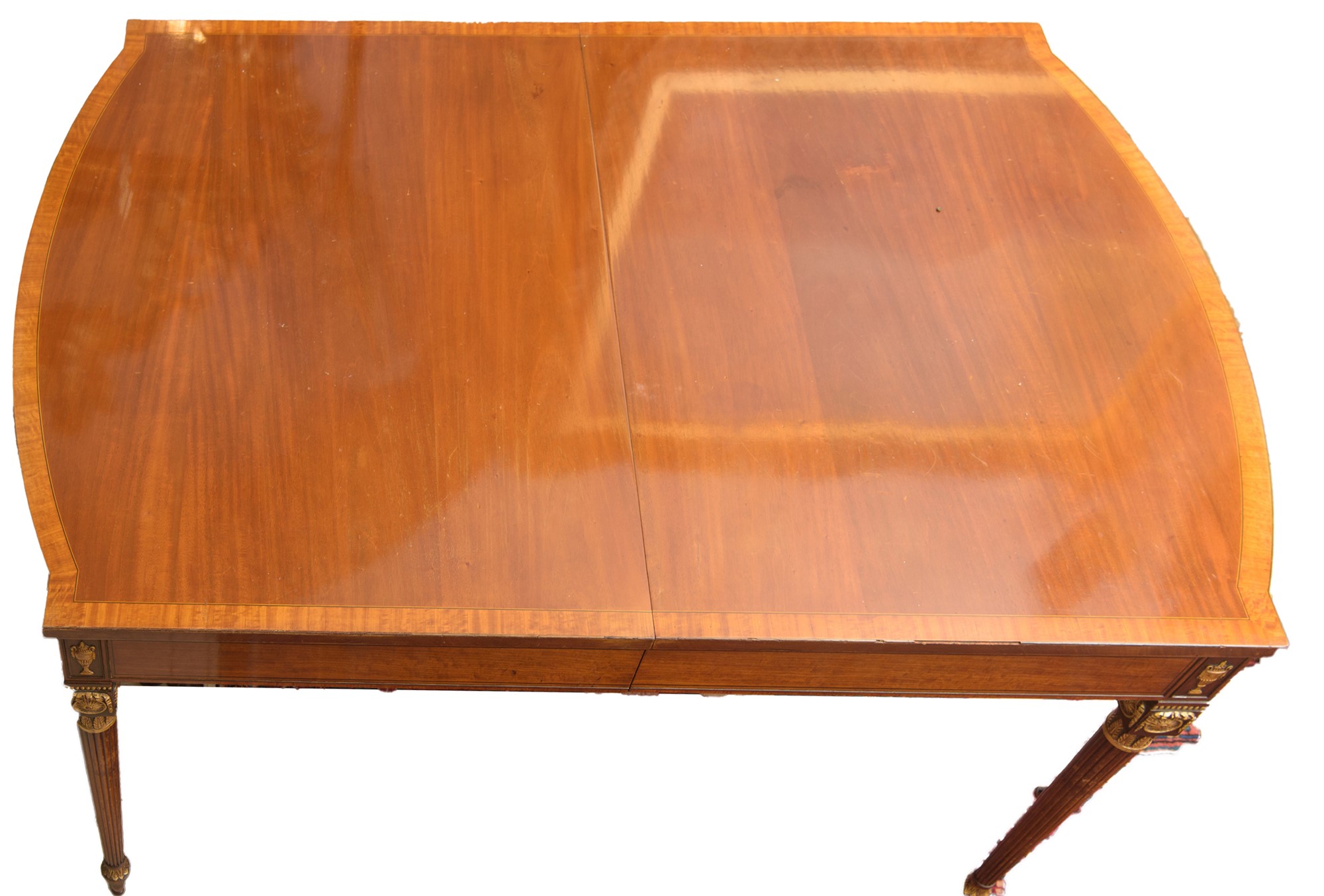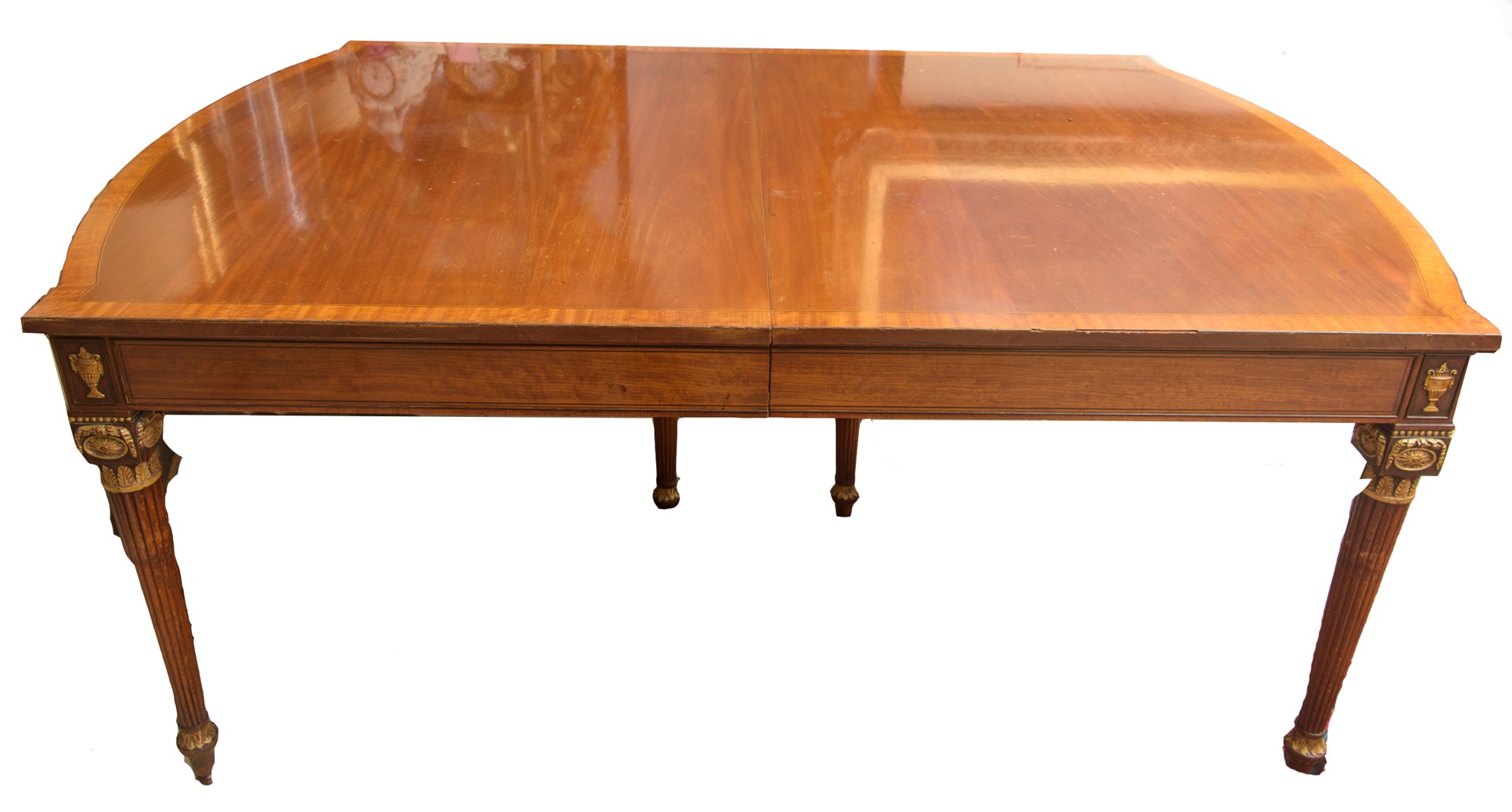 Di forma rettangolare con piano centinato. Poggiante su sei gambe baccellate e rastremate. Lumeggiature dorate. In legno di mogano e satinwood. Completo di due prolunghe da 60 cm complete di fascia coeve.