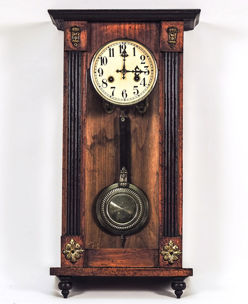 OROLOGIO PENSILE A PENDOLO IN LEGNO TENERO E NOCE - SOFTWOOD AND WALNUT WALL PENDULUM CLOCK XIX secolo - 19th Century cappello modanato, quadrante con numeri arabi, sportello con lesene scanalate ed applicazioni in metallo dorato, piedini a trottola h cm 62x32,5x16,5