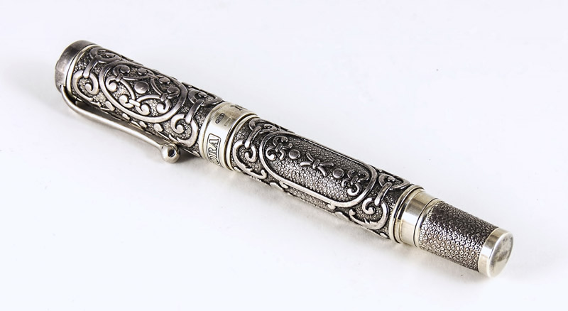 PENNA STILOGRAFICA IN ARGENTO STERLING - STERLING SILVER FOUNTAIN PEN Aurora, modello "Benvenuto Cellini" - Aurora, Model "Benvenuto Cellini" interamente cesellata, pennino in oro massiccio 18kt su condotta in ebanite e sistema di riserva nascosta, entro scatola originale Certificato di garanzia Aurora n°1253