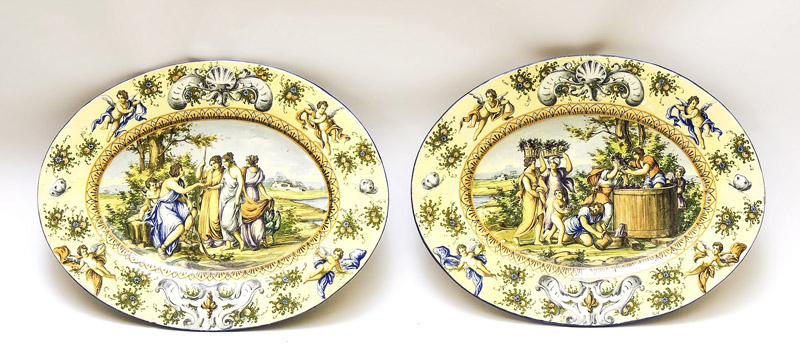 COPPIA DI VASSOI OVALI IN MAIOLICA POLICROMA - PAIR OF PAINTED MAJOLICA OVAL TRAYS Molaroni, inizio del XX secolo - early 20th Century dipinti con scene mitologiche e campestri, tese dipinte con putti, farfalle e motivi floreali su fondo giallo cm 48x62