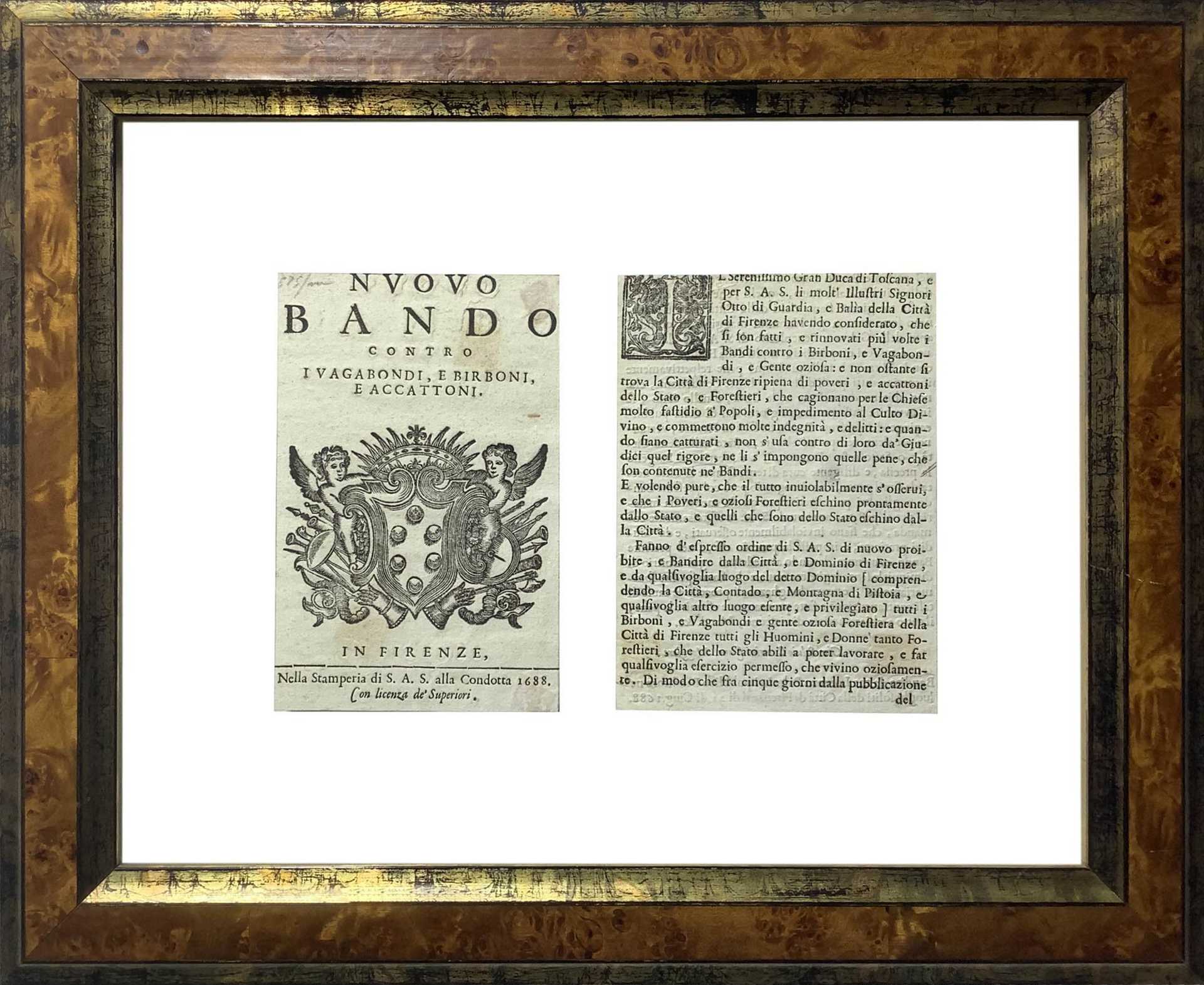 Stampa del nuovo bando contro i vagabondi e birboni e accattoni, 1688 Cm 17x25. In cornice a giorno doppio vetro cm 37,5x46 Rifilata e ritagliata nei bordi. Rifilata e ritagliata nei bordi.