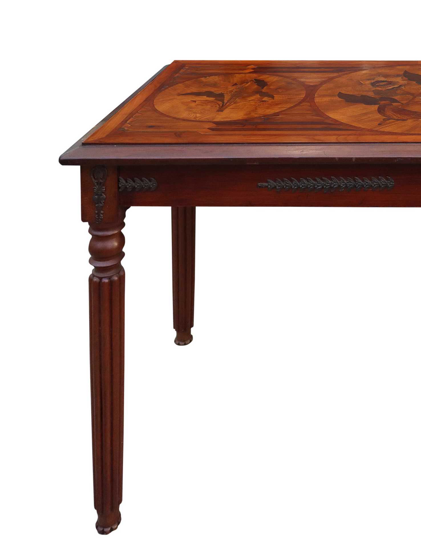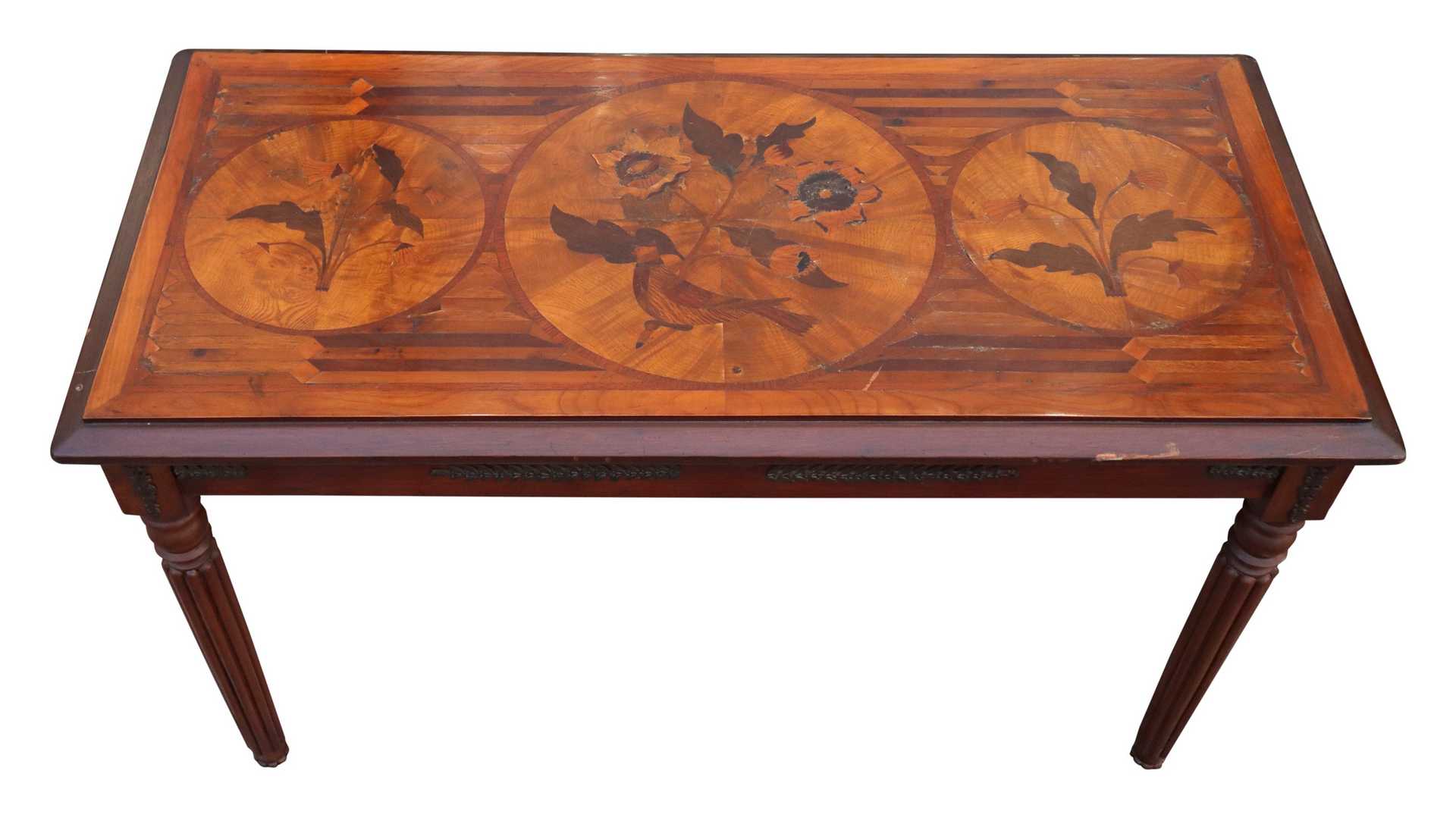 Tavolino rettangolare con piano intarsiato, Fine 19° secolo H cm 69x112x52 Piano intarsiato a motivi florerali in legni vari, palissandro, moganoPiano intarsiato a motivi florerali in legni vari, palissandro, mogano