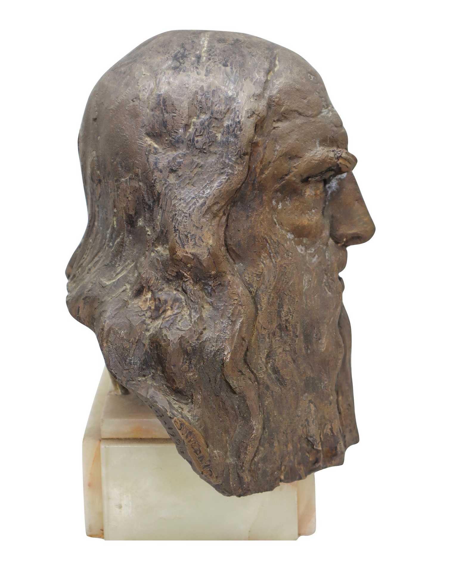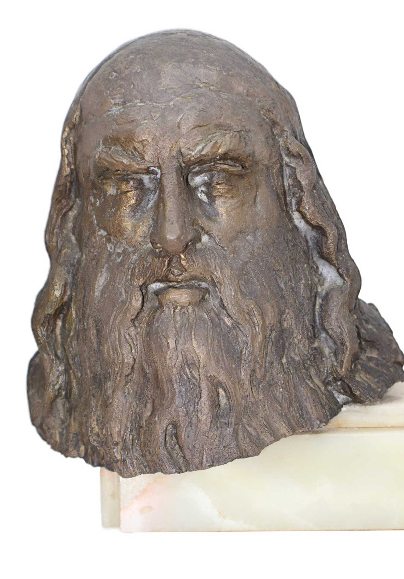 Volto di Leonardo da Vinci h cm 26, h base cm 7 x cm 25,5 x cm 13 Bronzo a cera persa Su base in onice bianco, firmato e datato 1954.