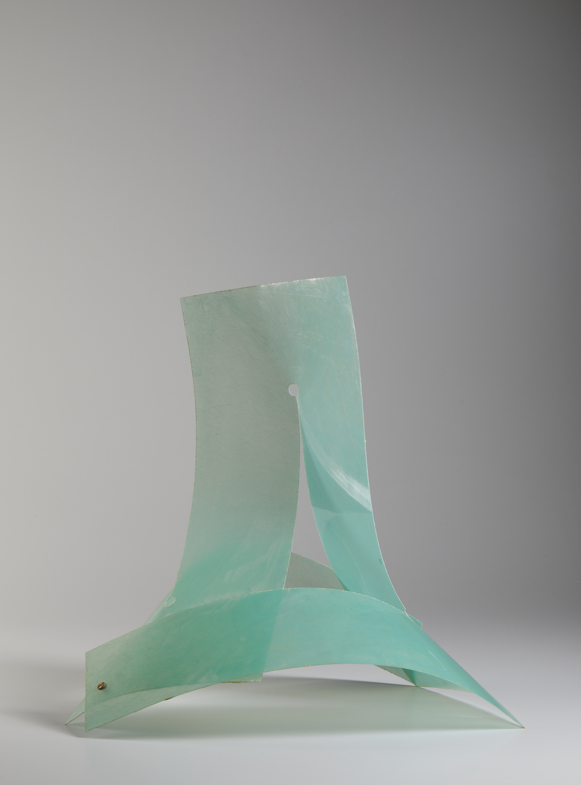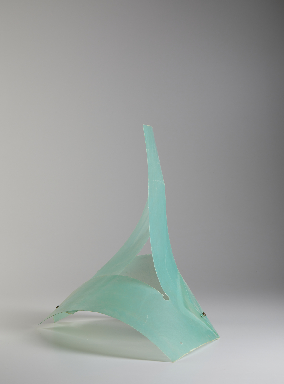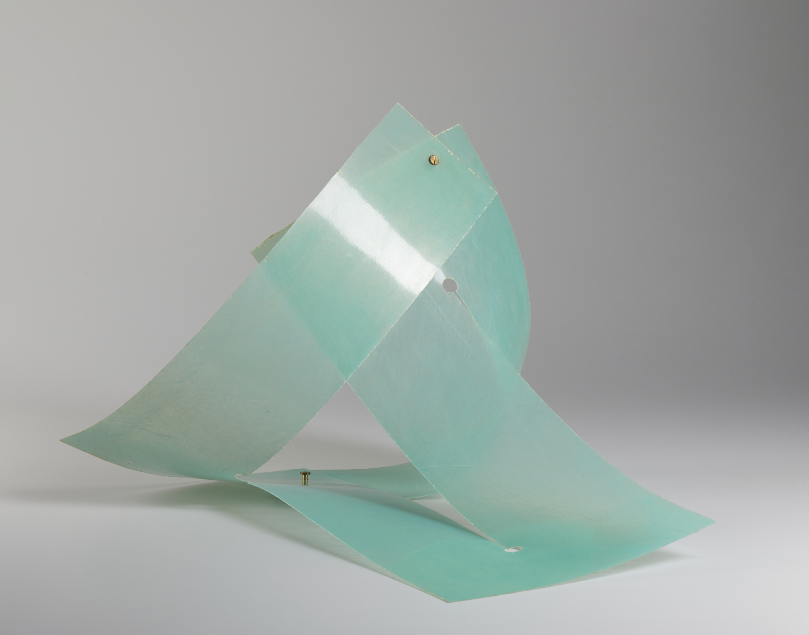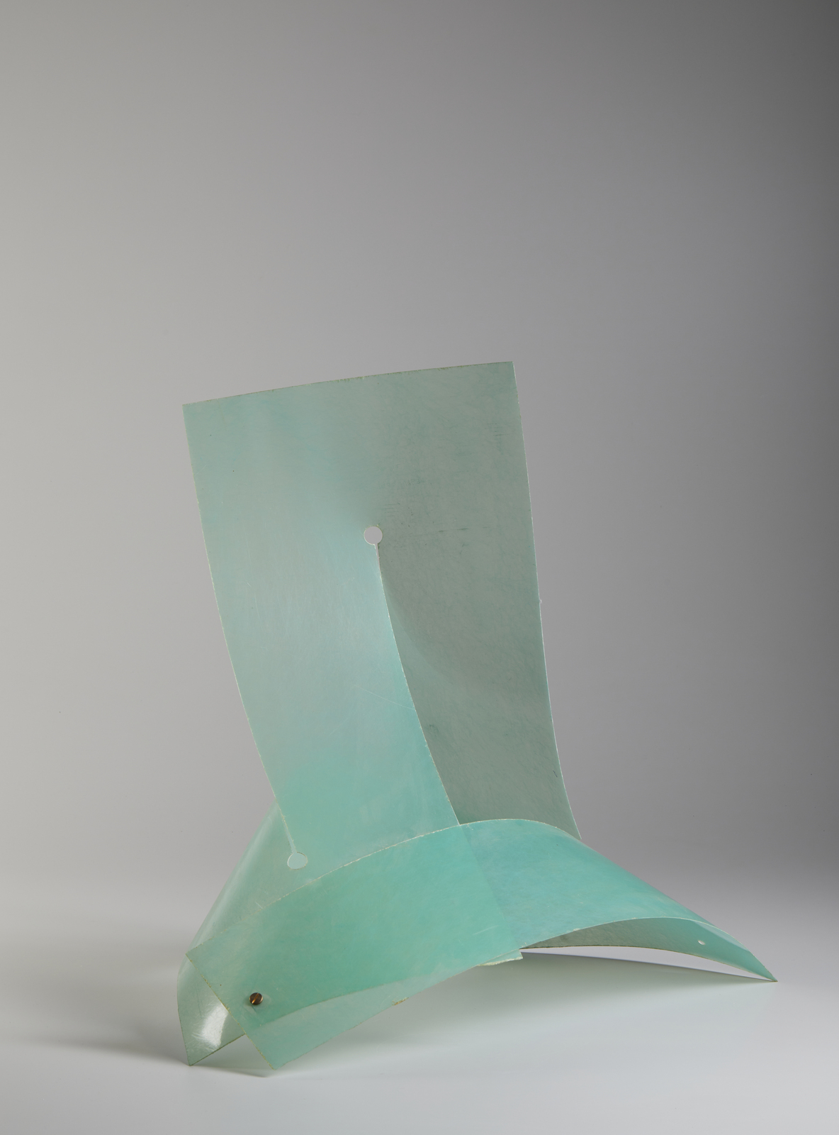 " Un quadrato di resina e fibra di vetro a tre tagli determinati dalle misure interne del quadrato stesso. La forma assume quindi la possibilità di combinazioni flessibili tra i quattro elementi collegati tra loro "