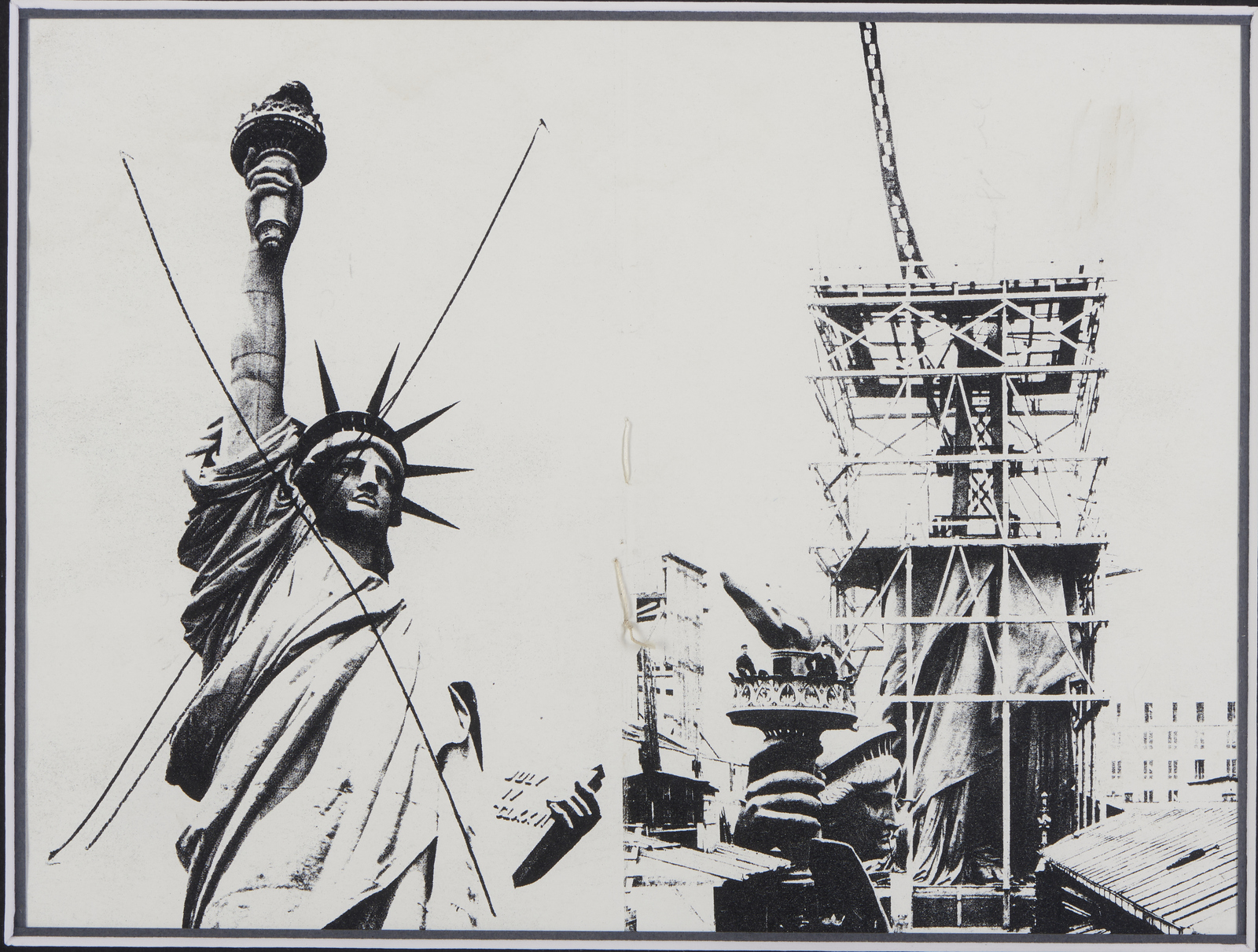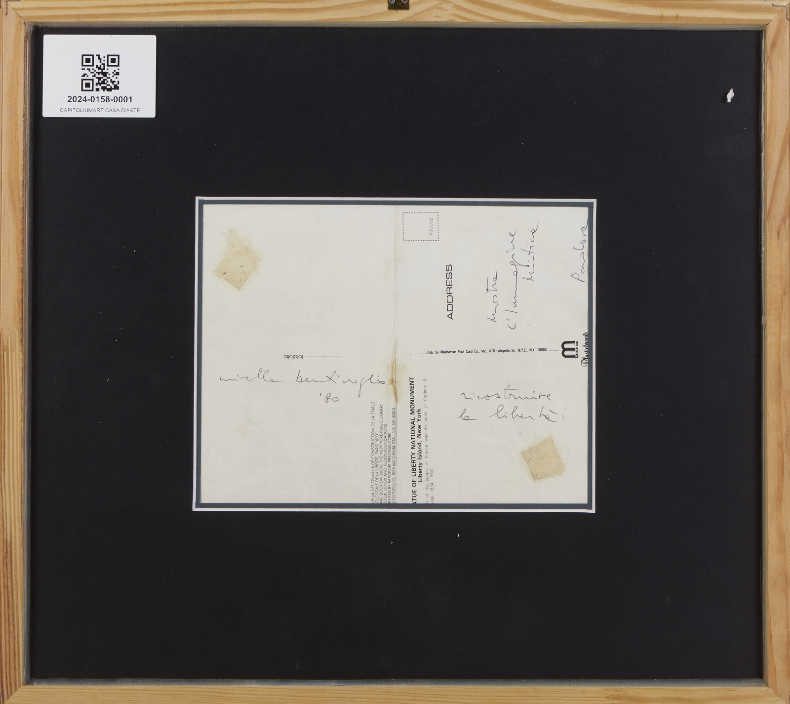 BENTIVOGLIO MIRELLA (n. 1922) RICOSTRUIRA LA LIBERTA', 1980. Intervento su cartolina. Cm 18,00 x 14,00. sul retro: titolo, firma e data. Cornice presente