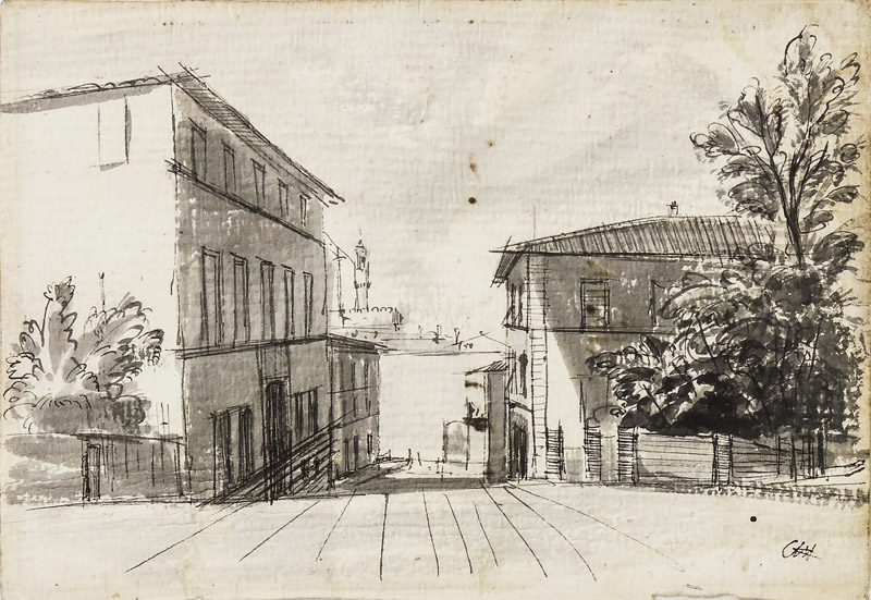 PIETRO ANNIGONI (1910-1988) Scorcio di Firenze - Florence View penna, inchiostro e acquerello monocromo su carta antica - pen, ink and monochrome watercolour on antique paper siglato cm 21,5x31