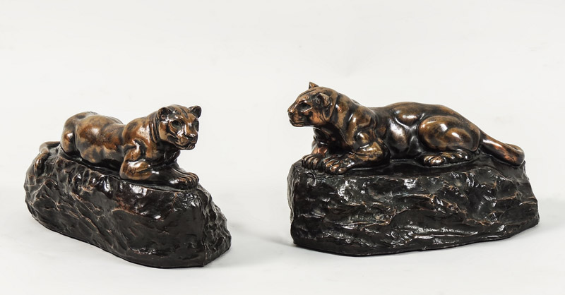 COPPIA DI FERMALIBRI IN METALLO PATINATO - PAIR OF PATINATED METAL BOOKENDS raffiguranti due pantere accucciate, su basi a finta roccia h cm 11