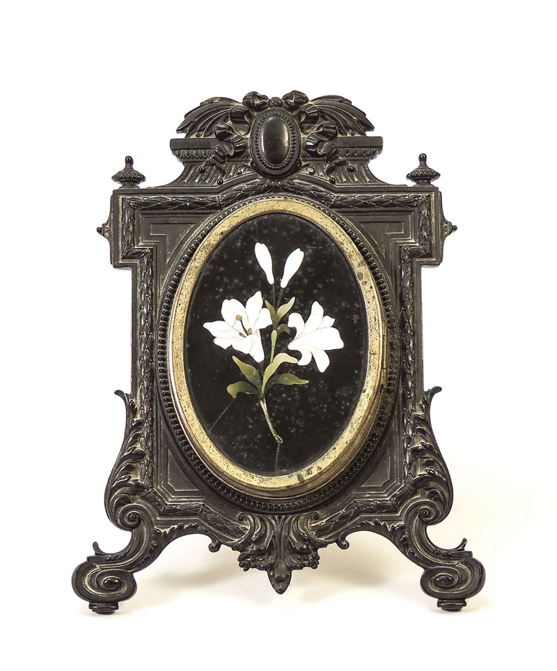 CORNICE PORTARITRATTI IN RESINA E PIETRE DURE - RESIN AND HARD STONE PICTURE FRAME inizio del XX secolo - early 20th Century forma sagomata ornata da festoni e foglie d'acanto, al centro placca ovale con commesso in pietre dure cm 26x20