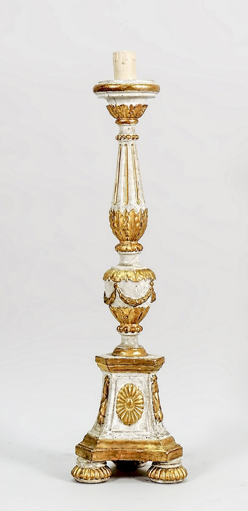 TORCIERA IN LEGNO LACCATO E DORATO - LACQUERED AND GILTWOOD PRICKET XIX secolo - 19th Century fusto tornito a balaustro, intagliato con foglie d'alloro e ghirlande, base a tripode con rosoni, su tre piedini a palla schiacciata baccellata h cm 71,5