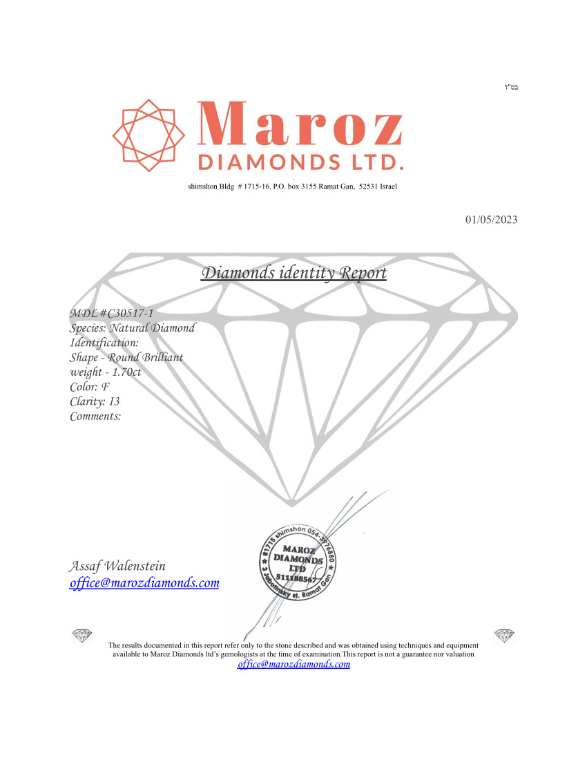 DIAMANTE 1,7 CARATI COLORE F - PUREZZA I3 - TAGLIO BRILLANTE - CERTIFICATO GEMMOLOGICO MAROZ DIAMONDS LTD MEMBRO ISRAEL DIAMOND EXCHANGE - C30517-1