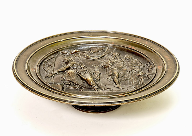 ALZATA IN BRONZO - BRONZE PEDESTAL CENTREPIECE al centro bassorilievo raffigurante una scena di Macbeth, firmata E. Picault h cm 8,5, diam cm 31,5
