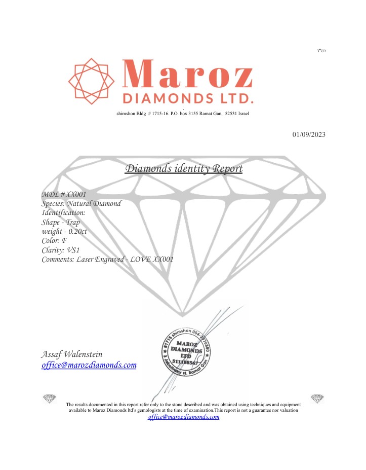 DIAMANTE 0,2 CT F - VS1 - TAGLIO TRAP - CERTIFICATO GEMMOLOGICO MAROZ DIAMONDS LTD MEMBRO ISRAEL DIAMOND EXCHANGEINCISO AL LASER - XX001