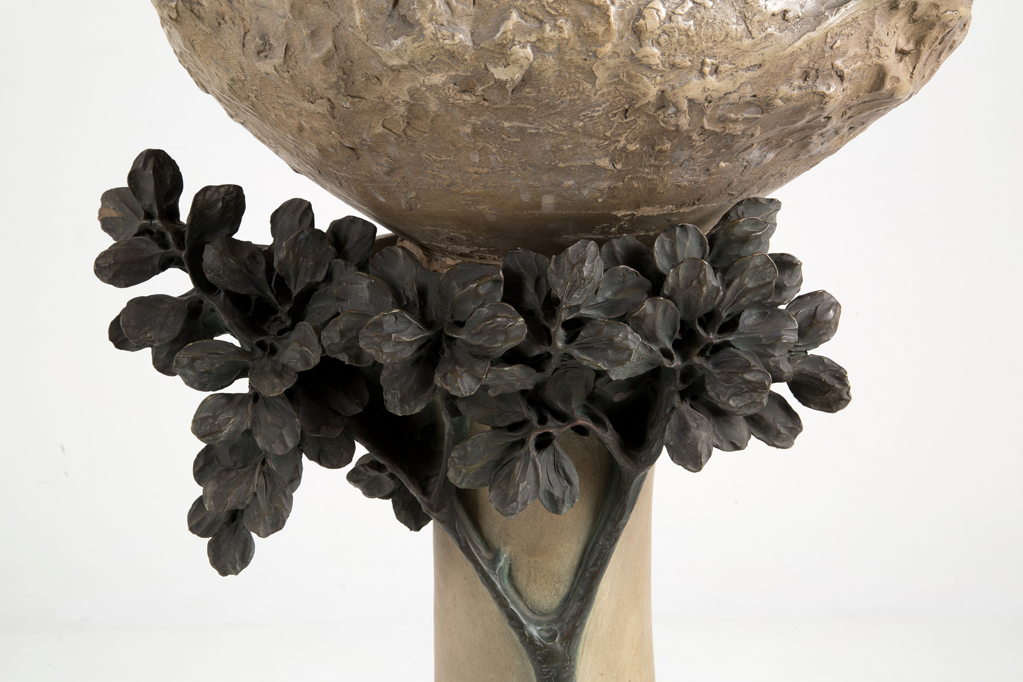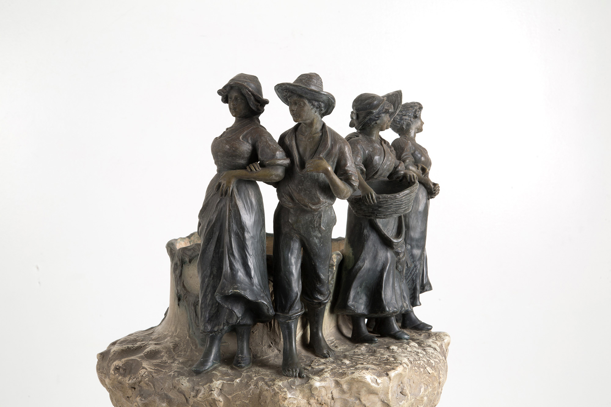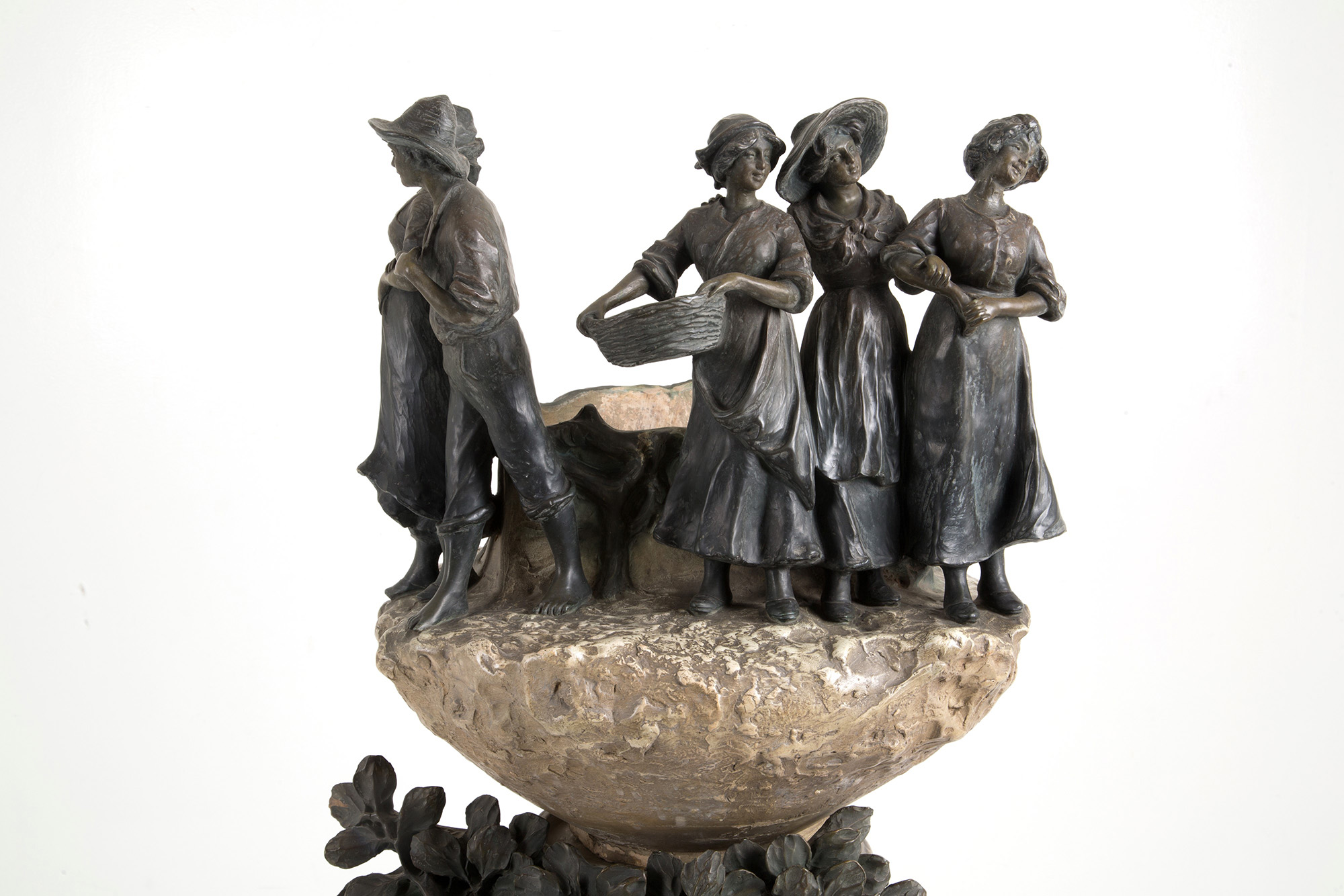 Column with terracotta vase decorated with fake bronze tree and shepherd children. Early 20th century. Minor defects. 154x56 cm approx. Colonna con vaso in terracotta decorata con albero e pastorelli a finto bronzo. Inizi XX secolo. Lievi difetti. 154x56 cm ca.