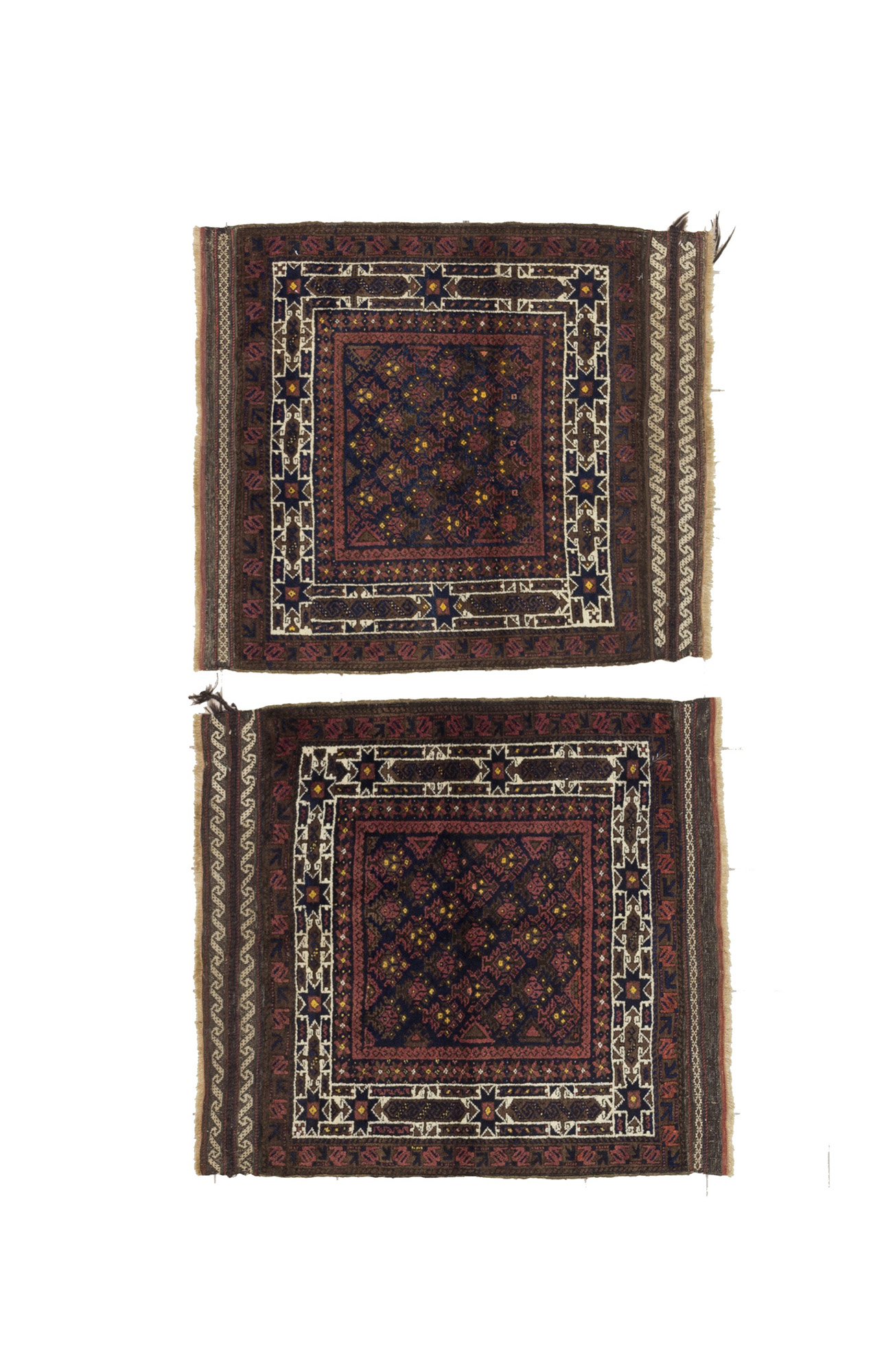 Pair of Bag Face Khorassan in wool. Persia. Circa 1900. Perfect state of preservation. Size cm. 86x76 approx. and 87x80 approx. Coppia Bag Face Khorassan in lana. Persia. Circa 1900. Perfetto stato di conservazione. Mis. cm. 86x76 ca. e 87x80 ca.