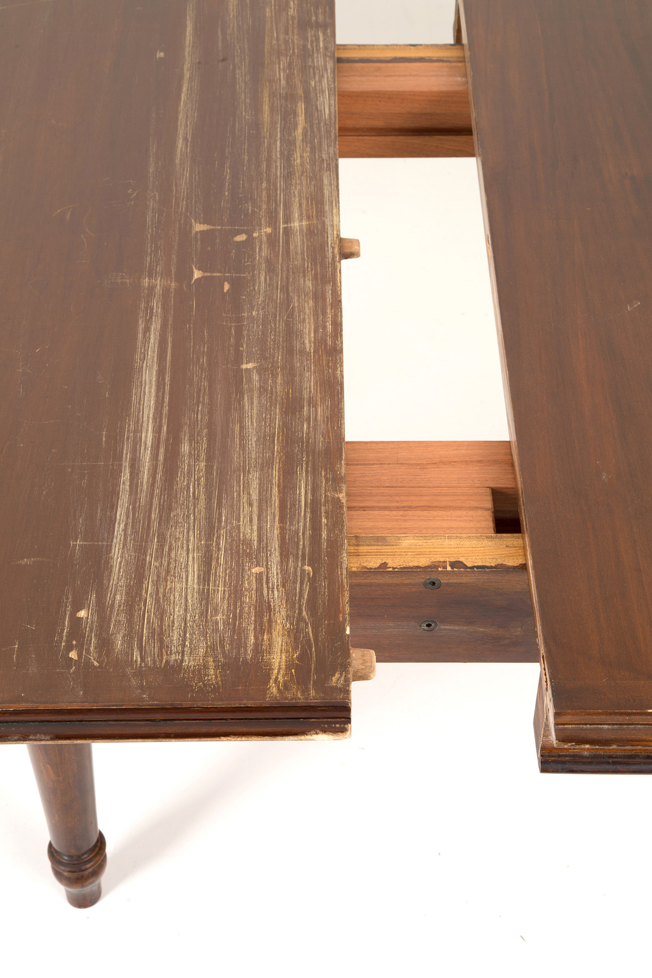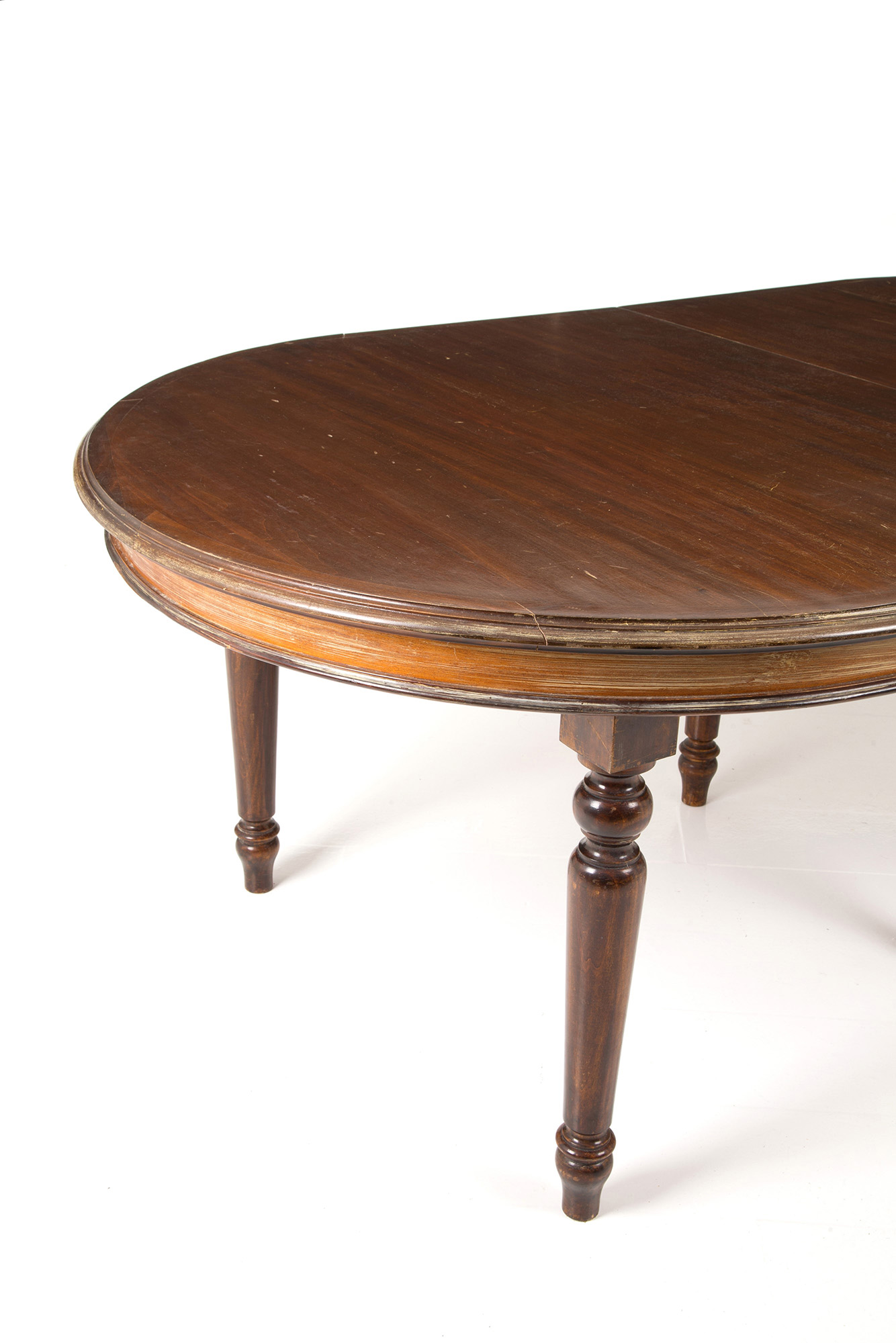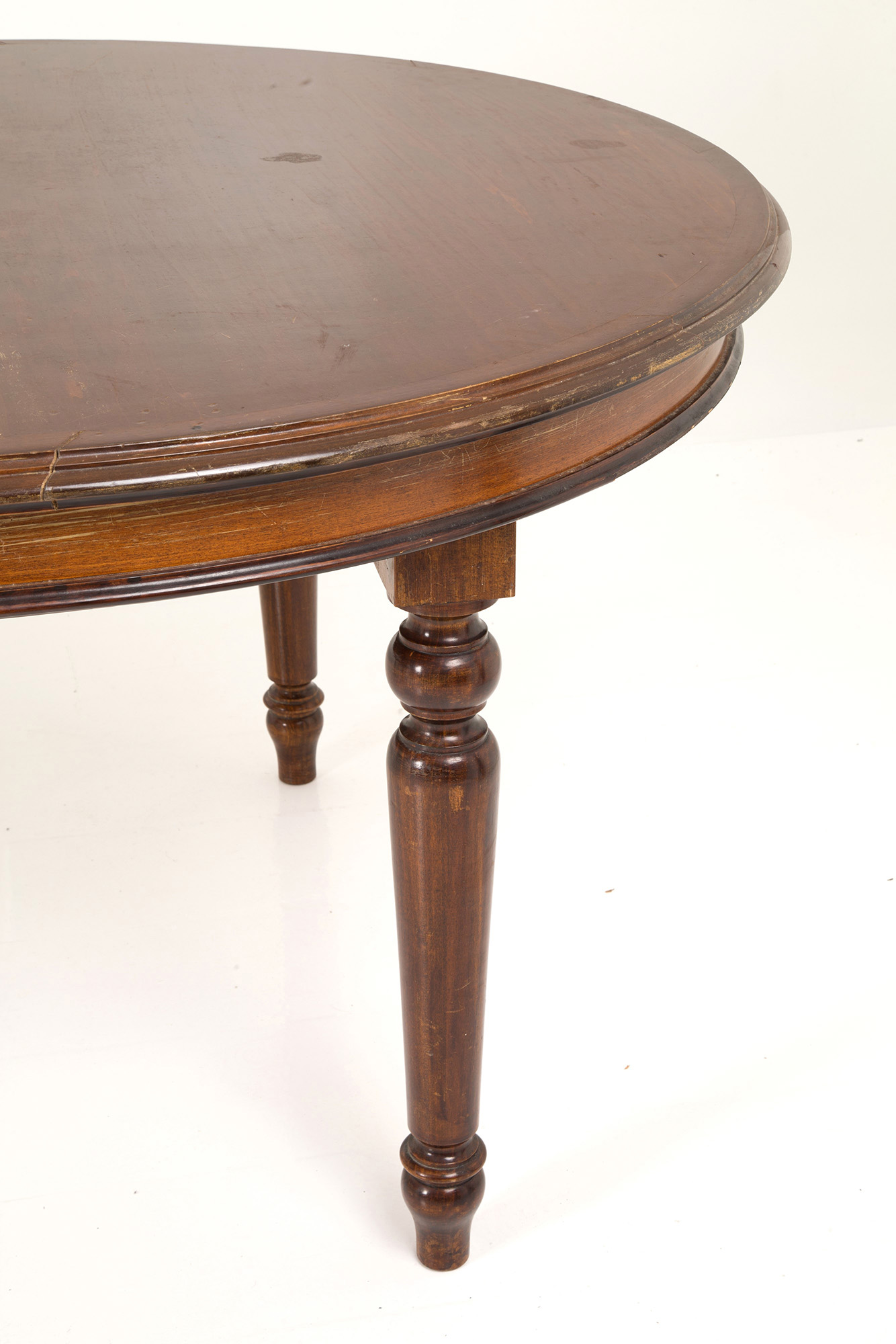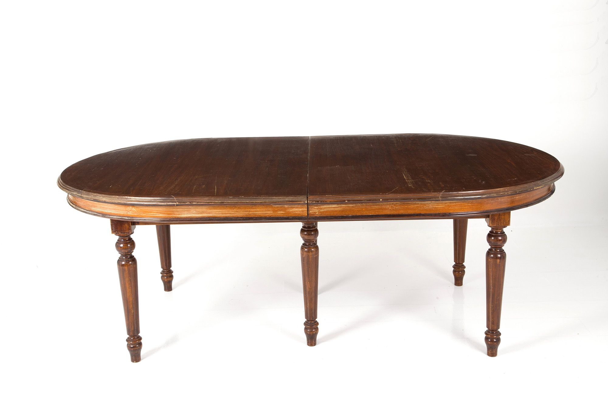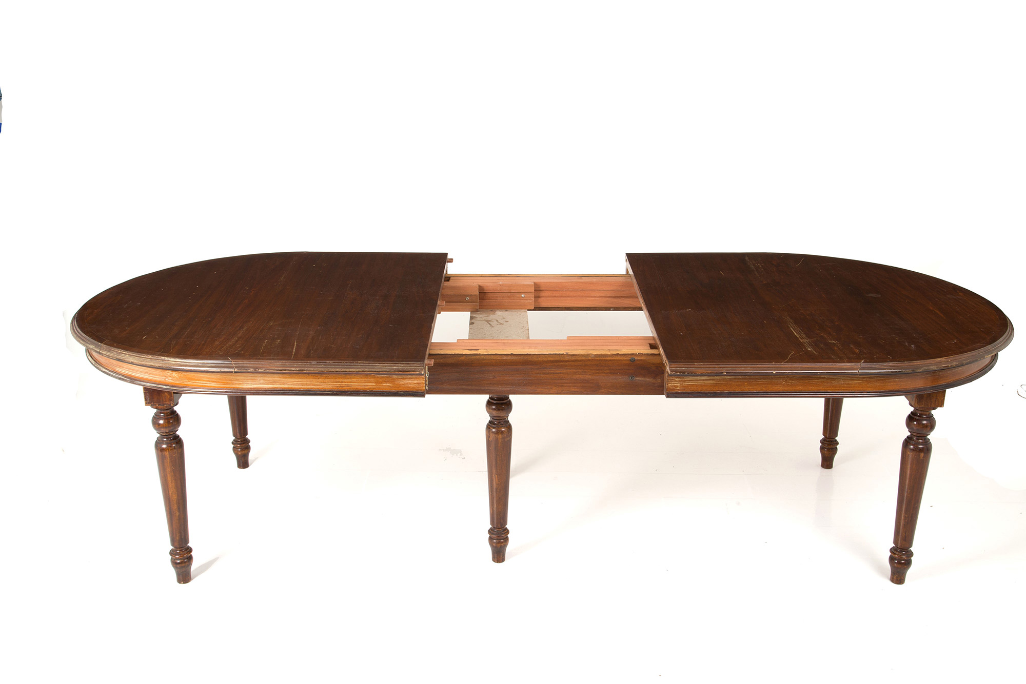 Oval extendable wooden table with four extensions and turned legs. 19th century. Defects.