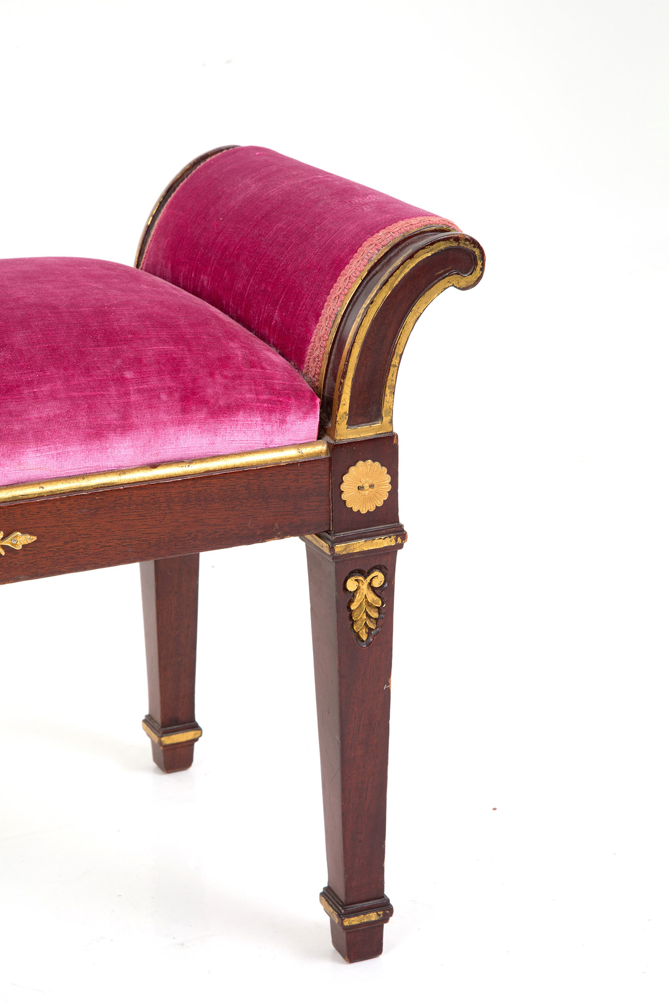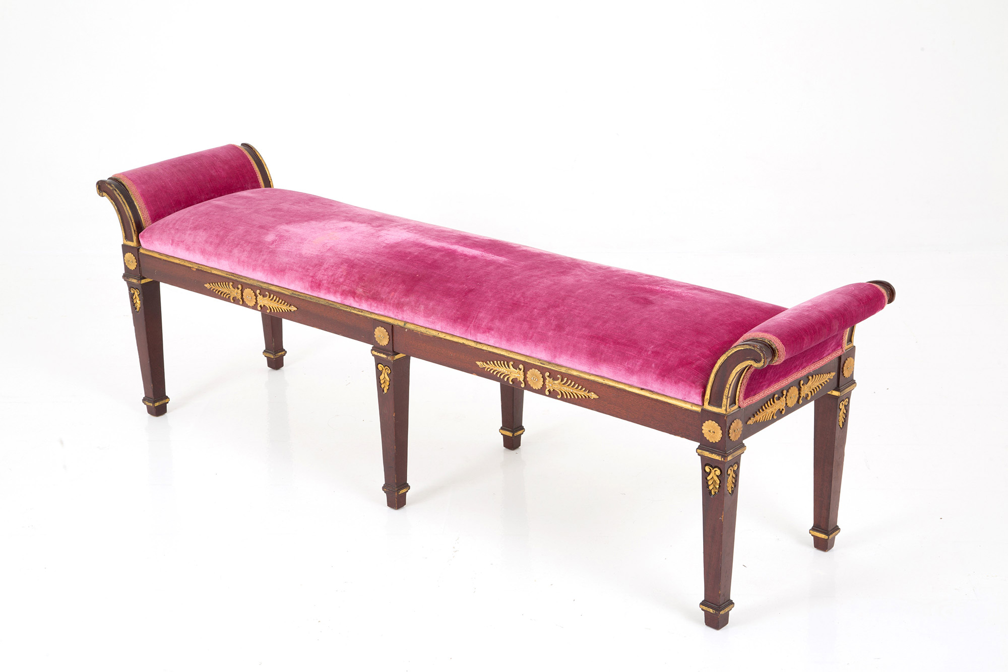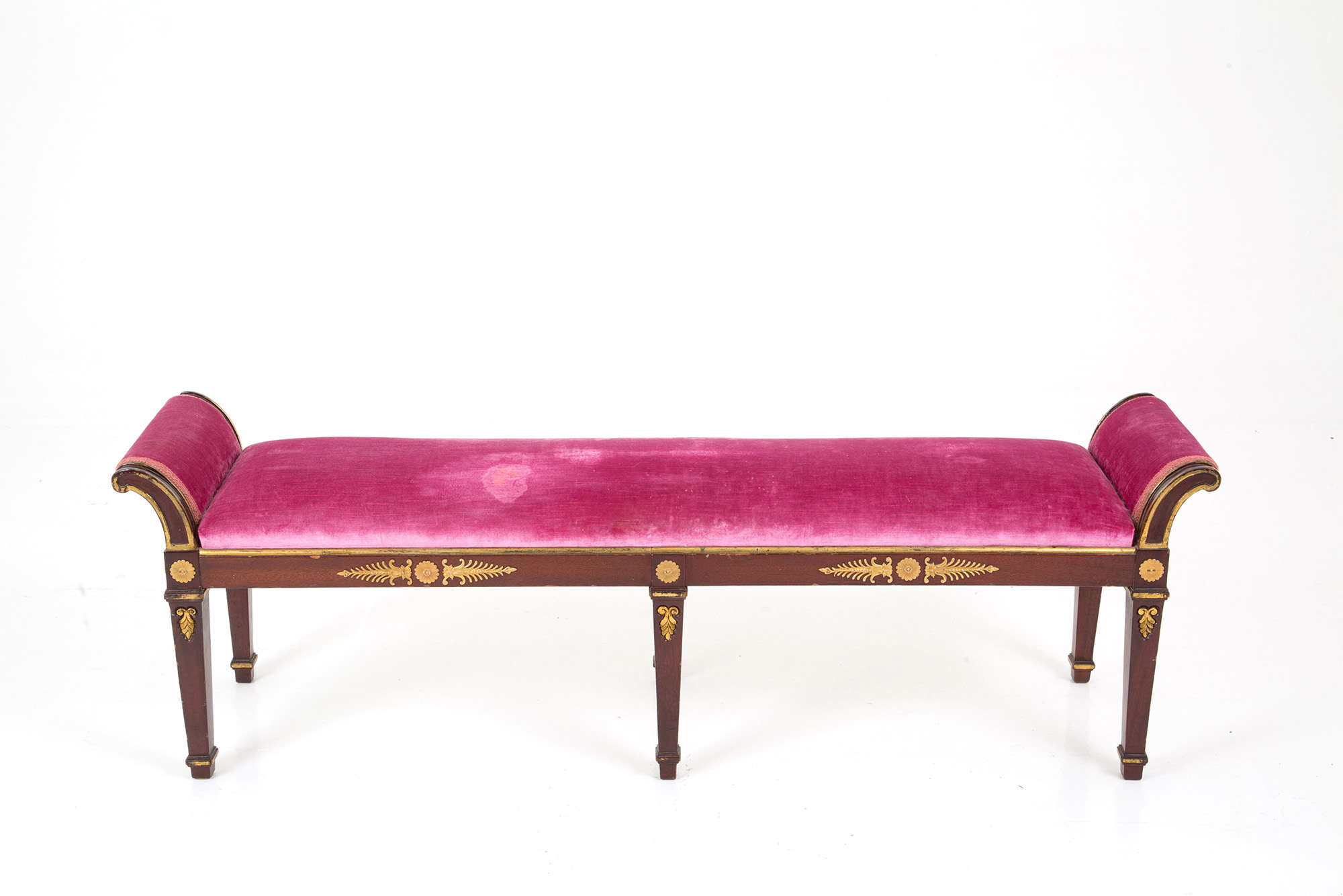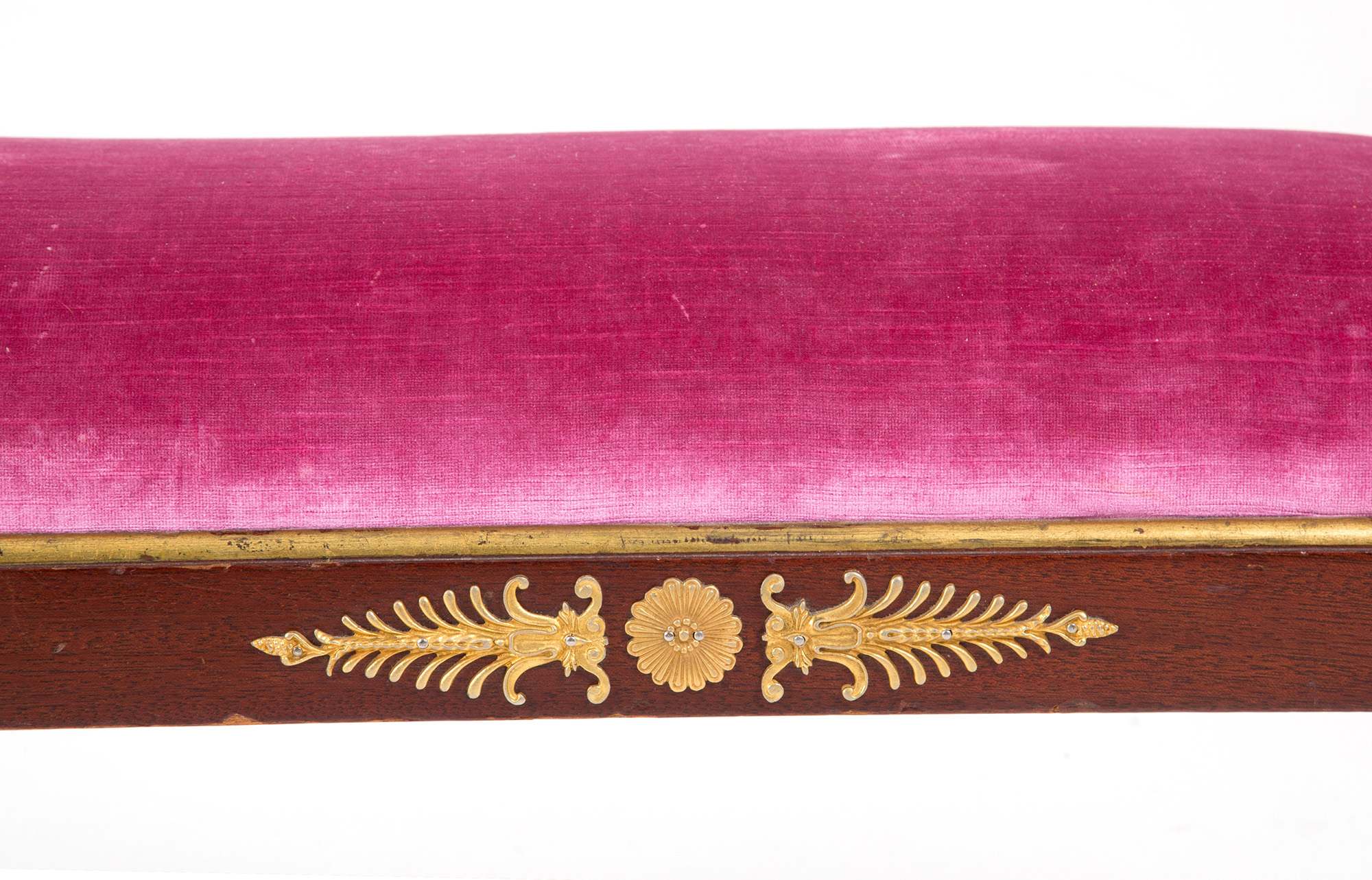 Carved and gilded wooden bench with gilded bronze applications and padded seat covered in velvet. Empire style. 47x150x36 cm approx. Panchetta in legno intagliato e dorato con applicazioni in bronzo dorato e seduta imbottita rivestita in velluto. Stile impero. 47x150x36 cm ca.