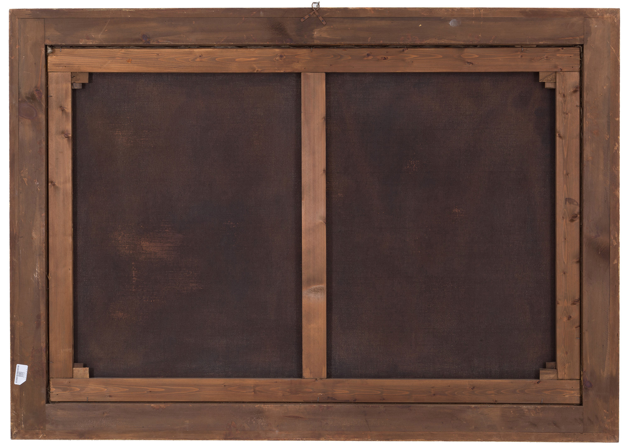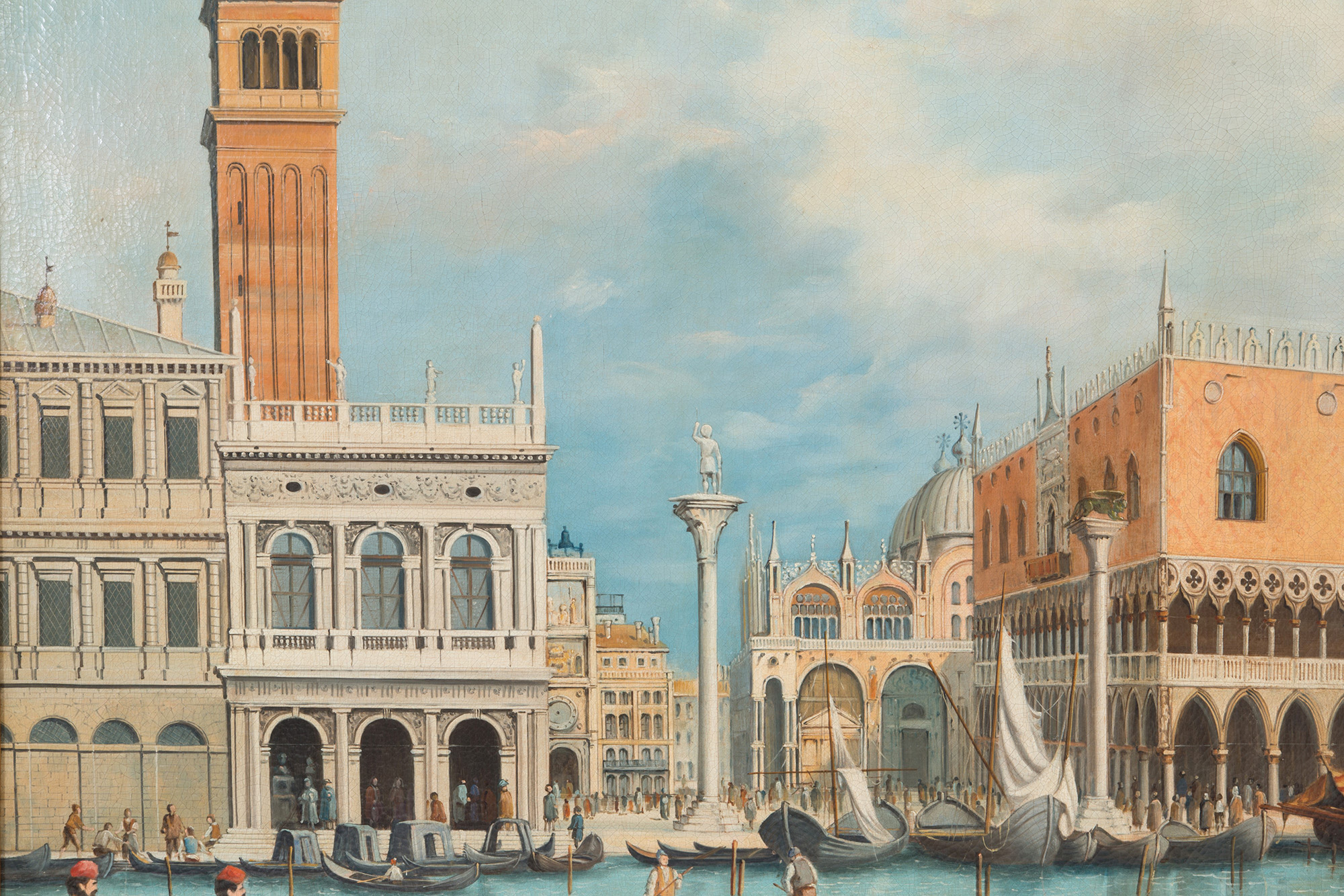 Oil painting on canvas depicting "DUCAL PALACE WITH A GLIMPSE OF SAN MARCO AND THE LAGOON". 20th century. In frame. 100x150cm approx. Dipinto olio su tela raffigurante "PALAZZO DUCALE CON SCORCIO DI SAN MARCO E LAGUNA". XX secolo. In cornice. 100x150 cm ca.