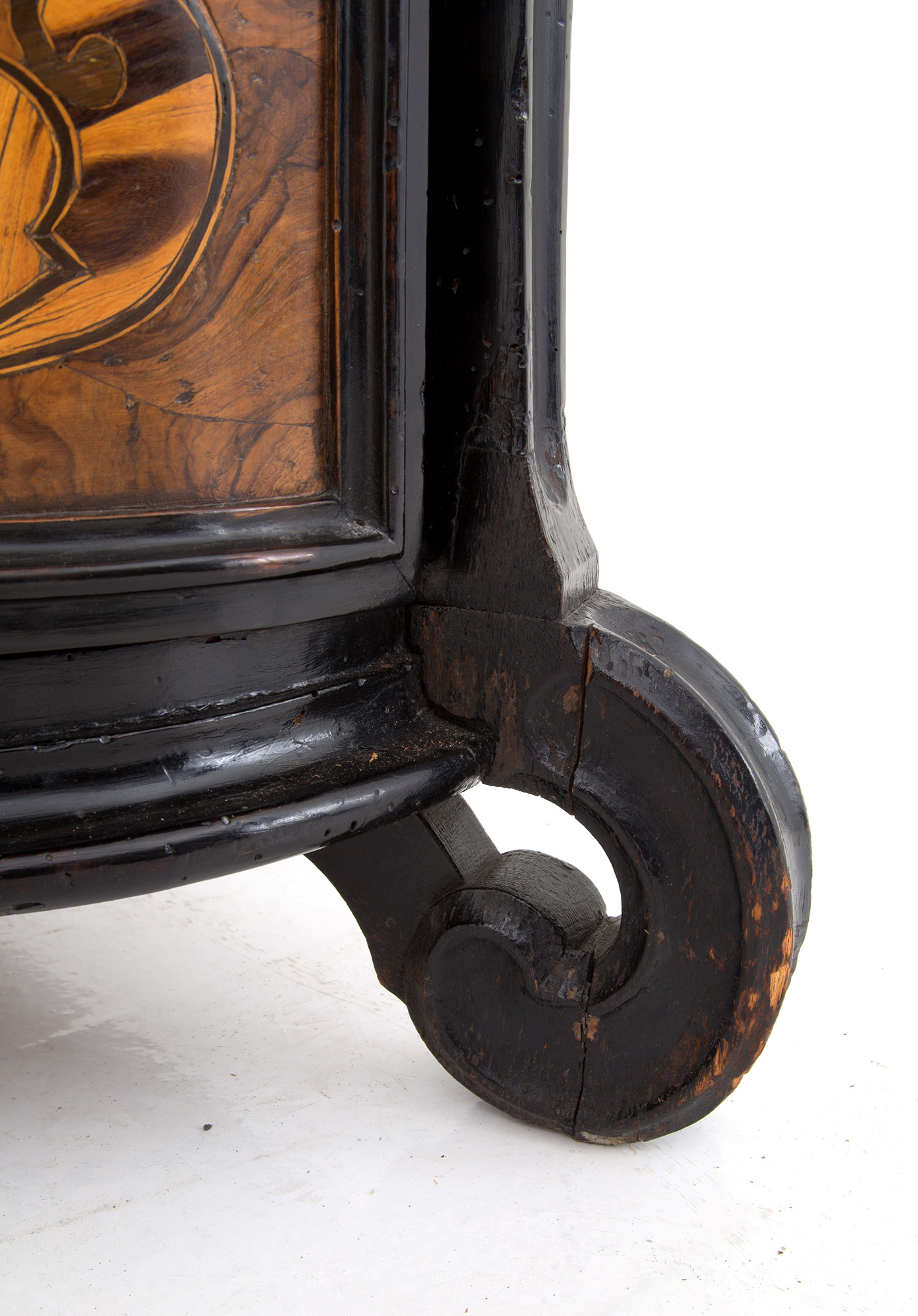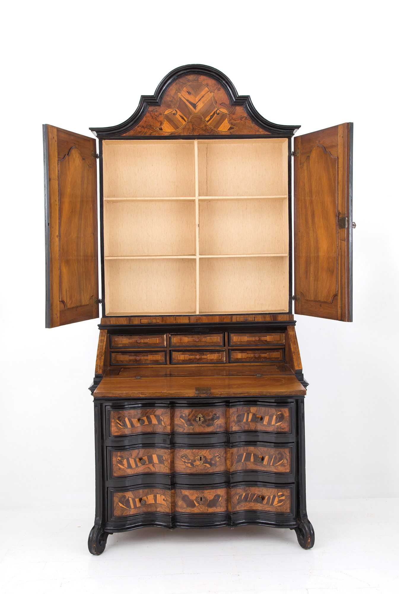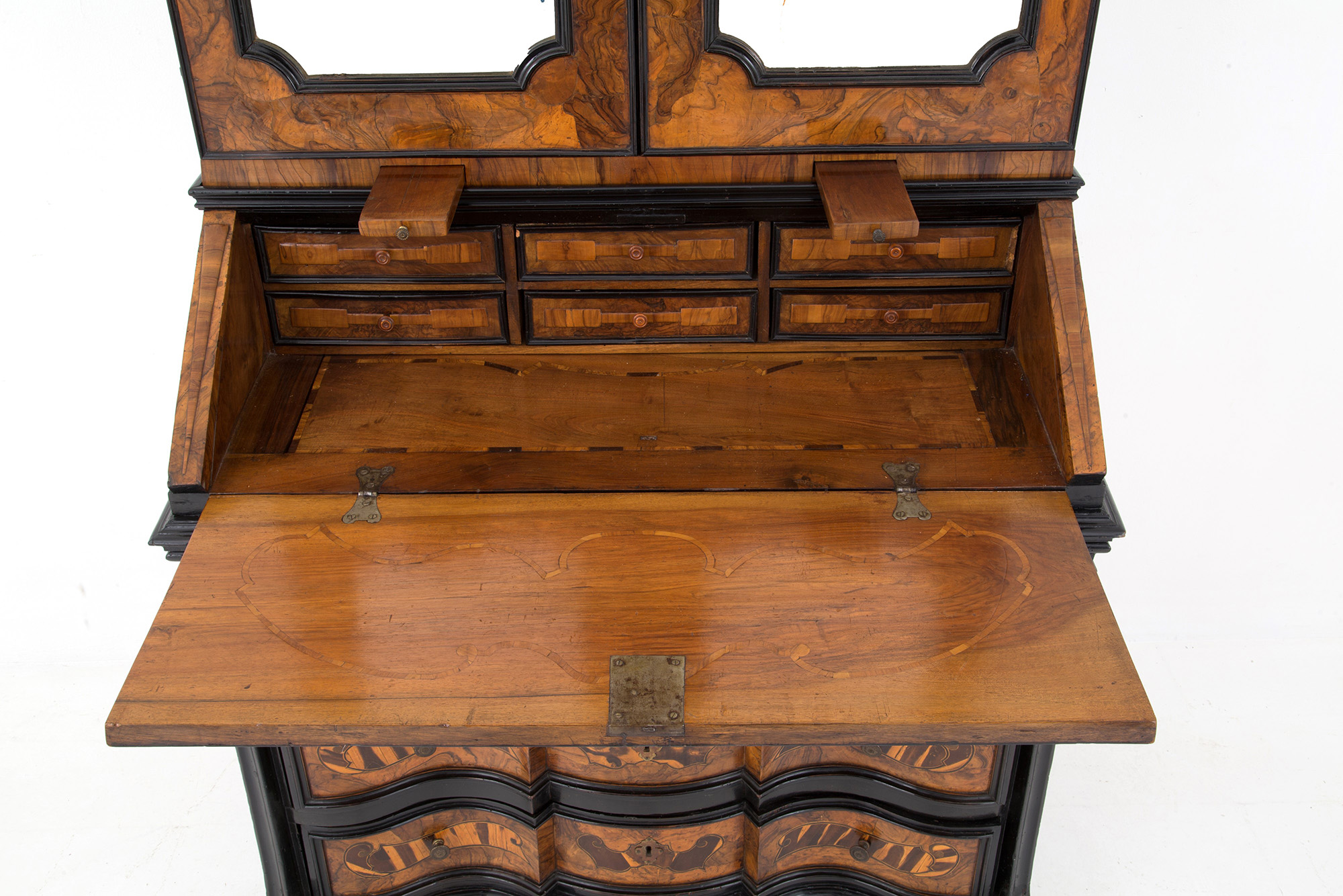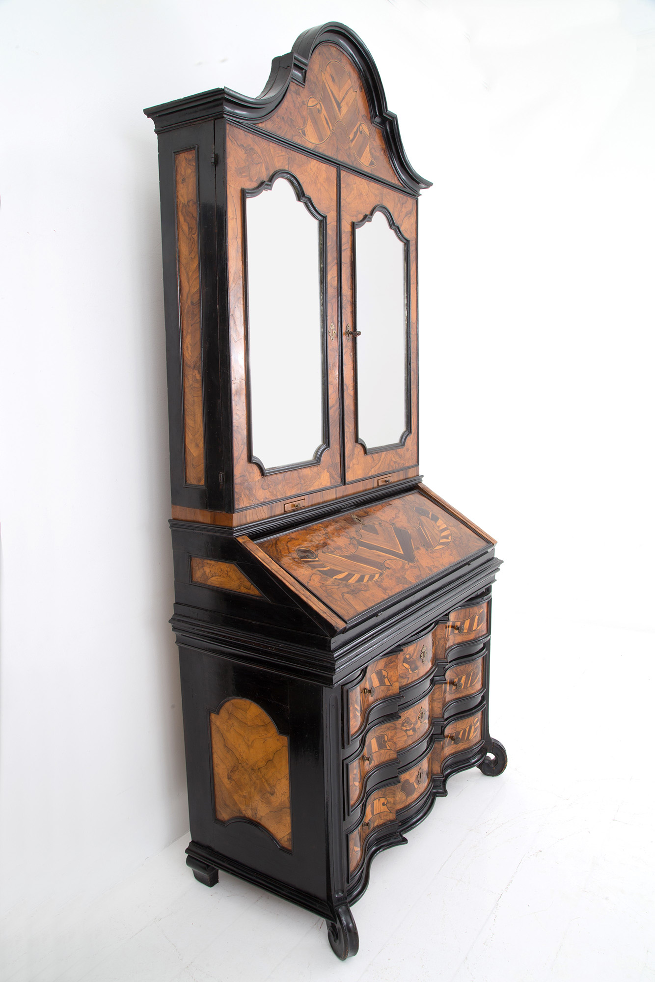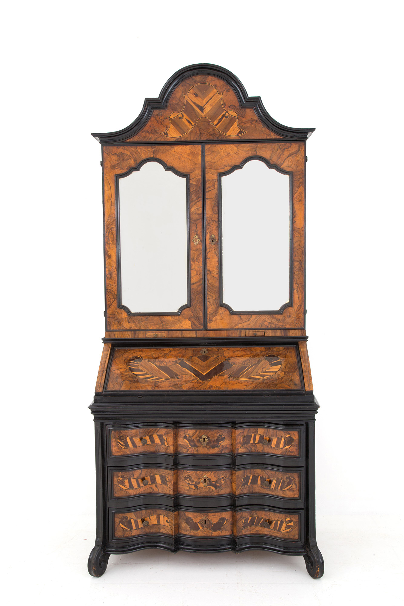Trumeau moved on the veneered front and inlaid in various woods with three drawers and drawer in the lower part and two mirrored doors in the upper part. Veneto. Early 18th century. 245x107x60 cm approx. Trumeau mosso sul fronte lastronato e intarsiato in legni vari con tre cassetti e calatoia nella parte inferiore e due ante a specchio in quella superiore. Veneto. Inizi XVIII secolo. 245x107x60 cm ca.
