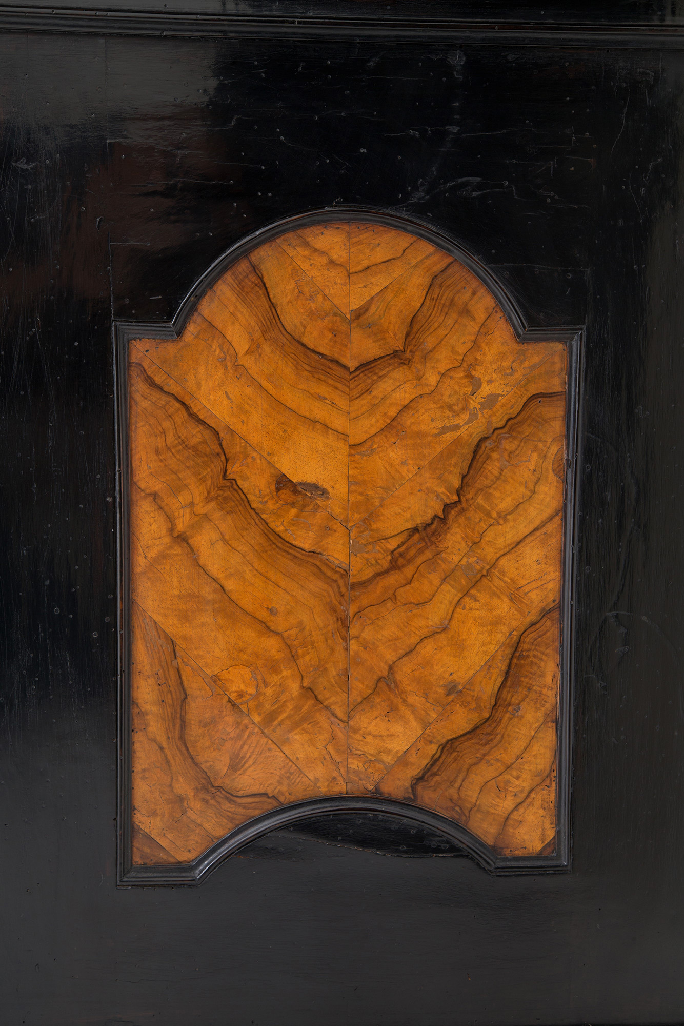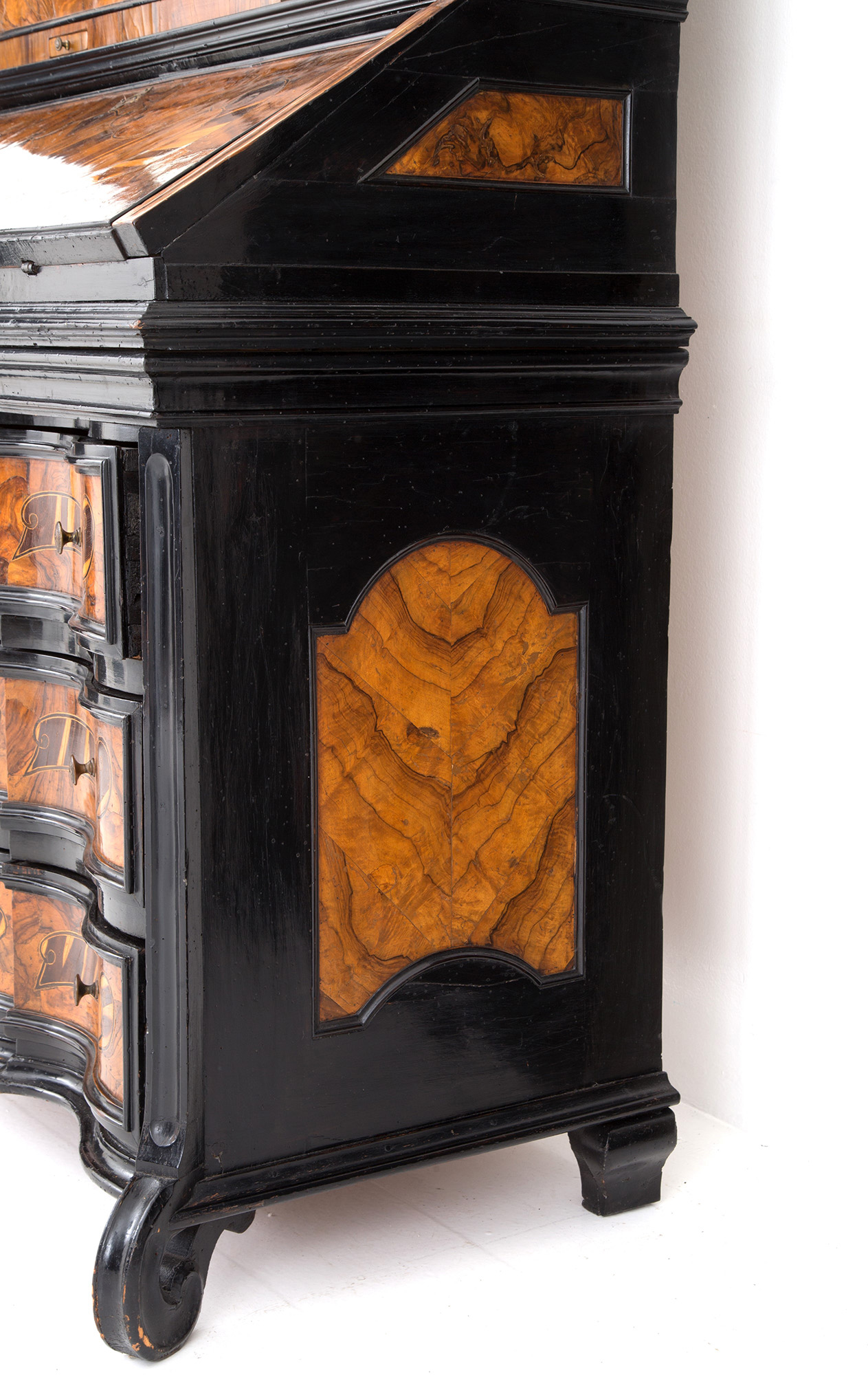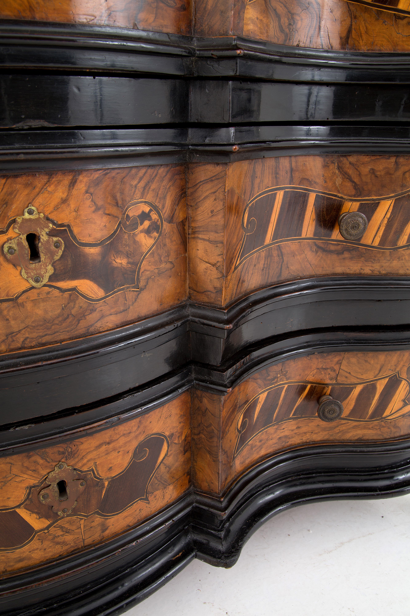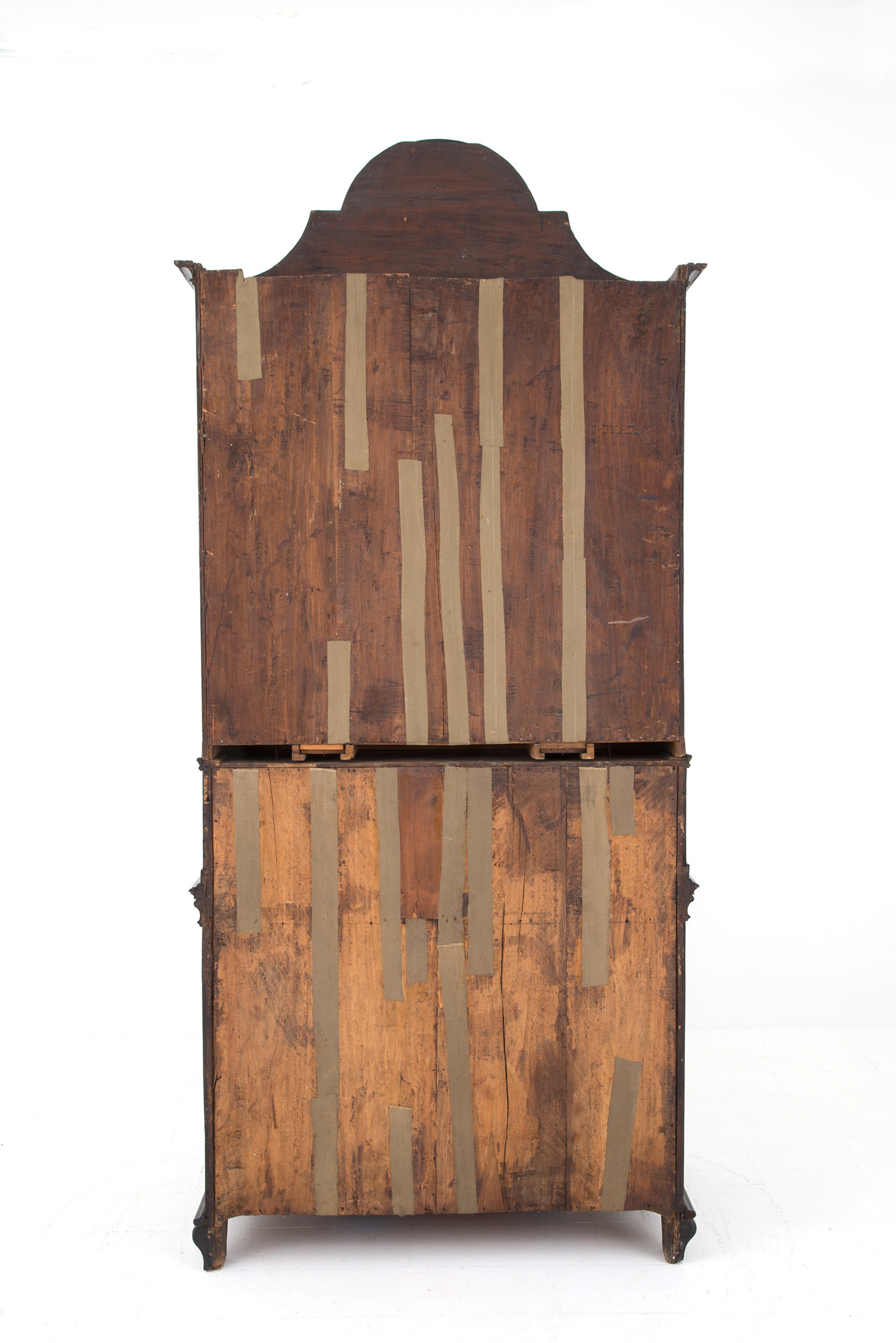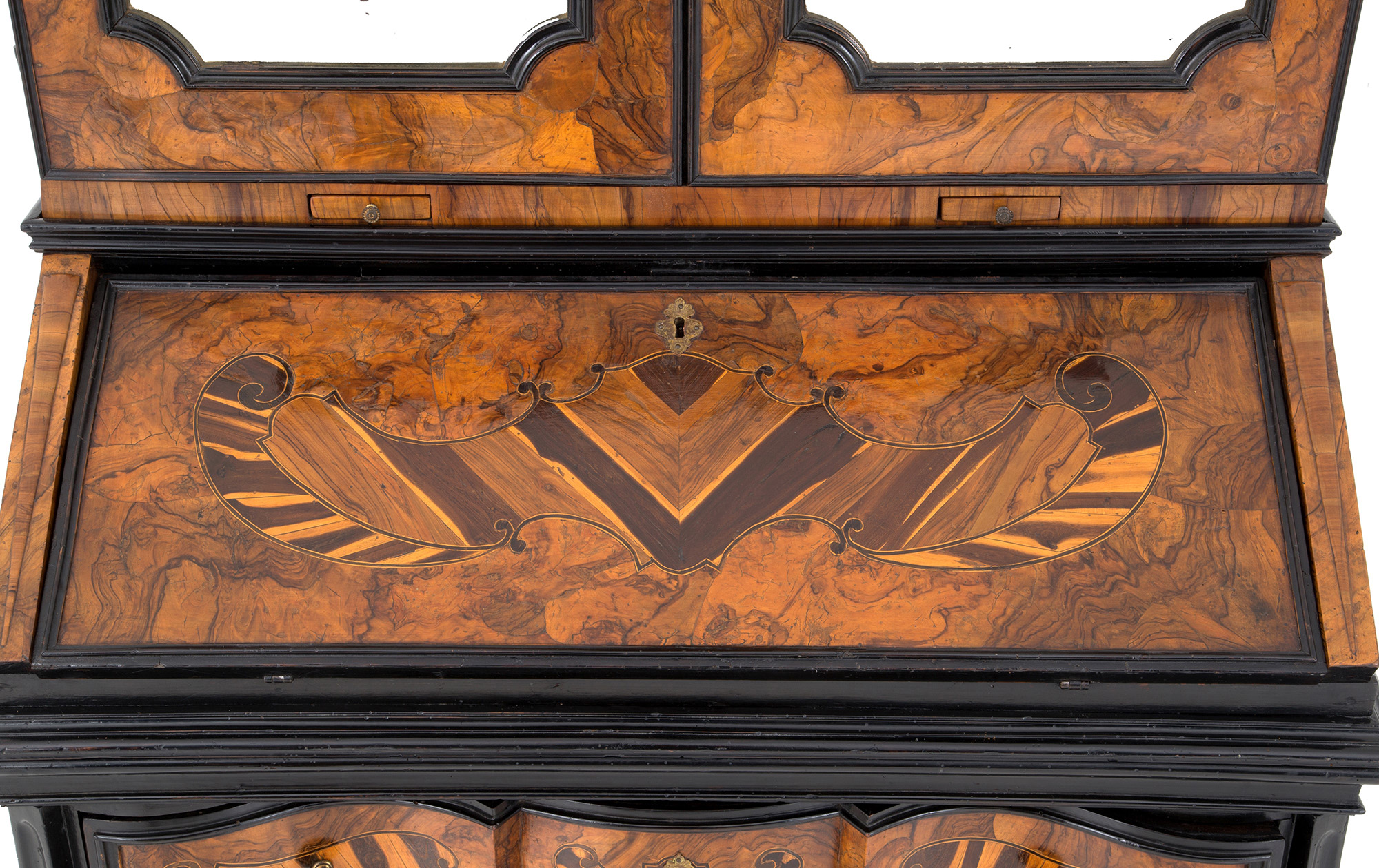 Trumeau moved on the veneered front and inlaid in various woods with three drawers and drawer in the lower part and two mirrored doors in the upper part. Veneto. Early 18th century. 245x107x60 cm approx. Trumeau mosso sul fronte lastronato e intarsiato in legni vari con tre cassetti e calatoia nella parte inferiore e due ante a specchio in quella superiore. Veneto. Inizi XVIII secolo. 245x107x60 cm ca.
