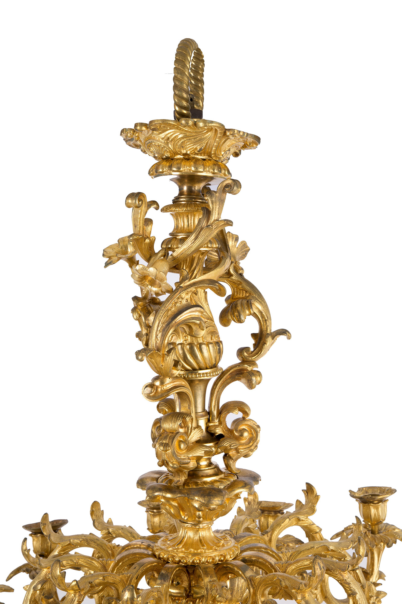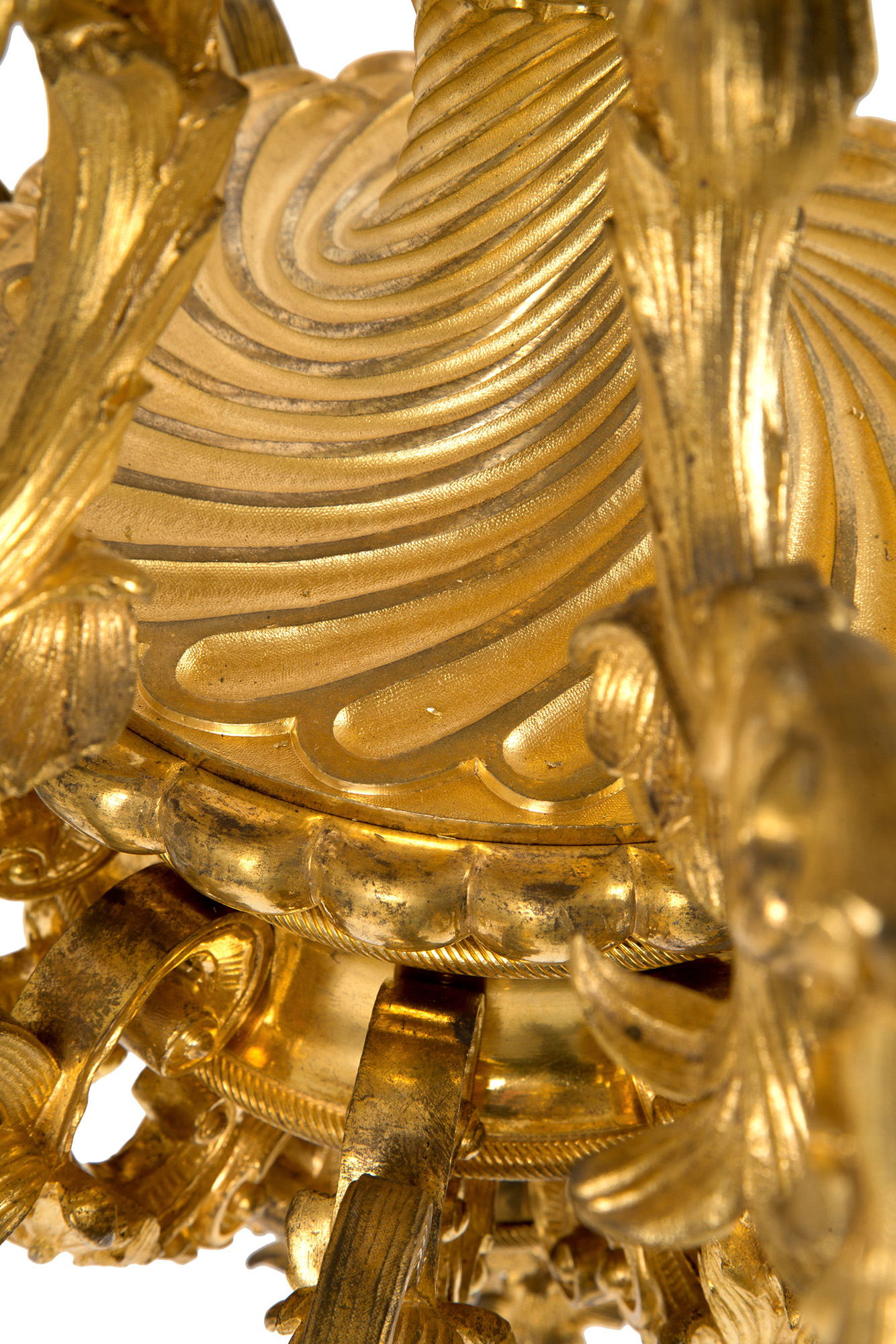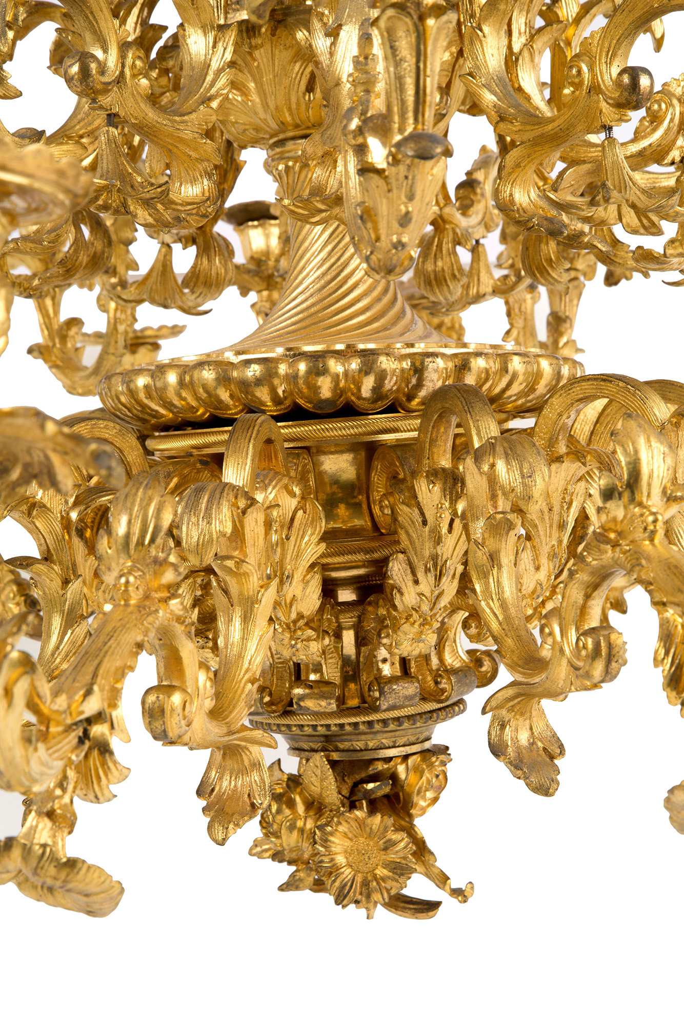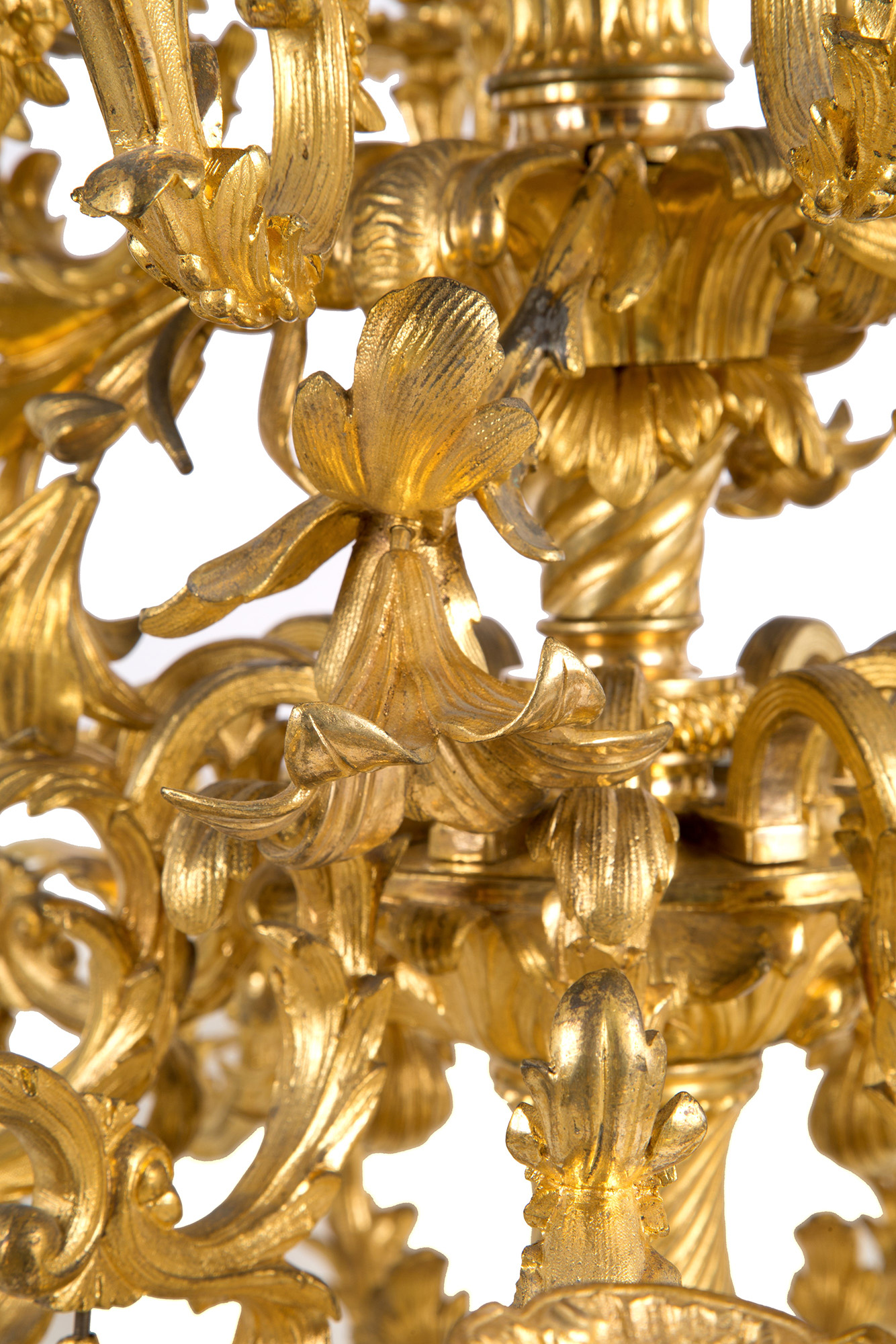 Three-stage gilt bronze chandelier, total weight approx. 87 kg. Transition period Louis XV-Louis XVII. 140x115 cm approx. Lampadario in bronzo dorato a tre palchi, peso complessivo 87 kg ca. Periodo transizione Luigi XV-Luigi XVII. 140x115 cm ca.