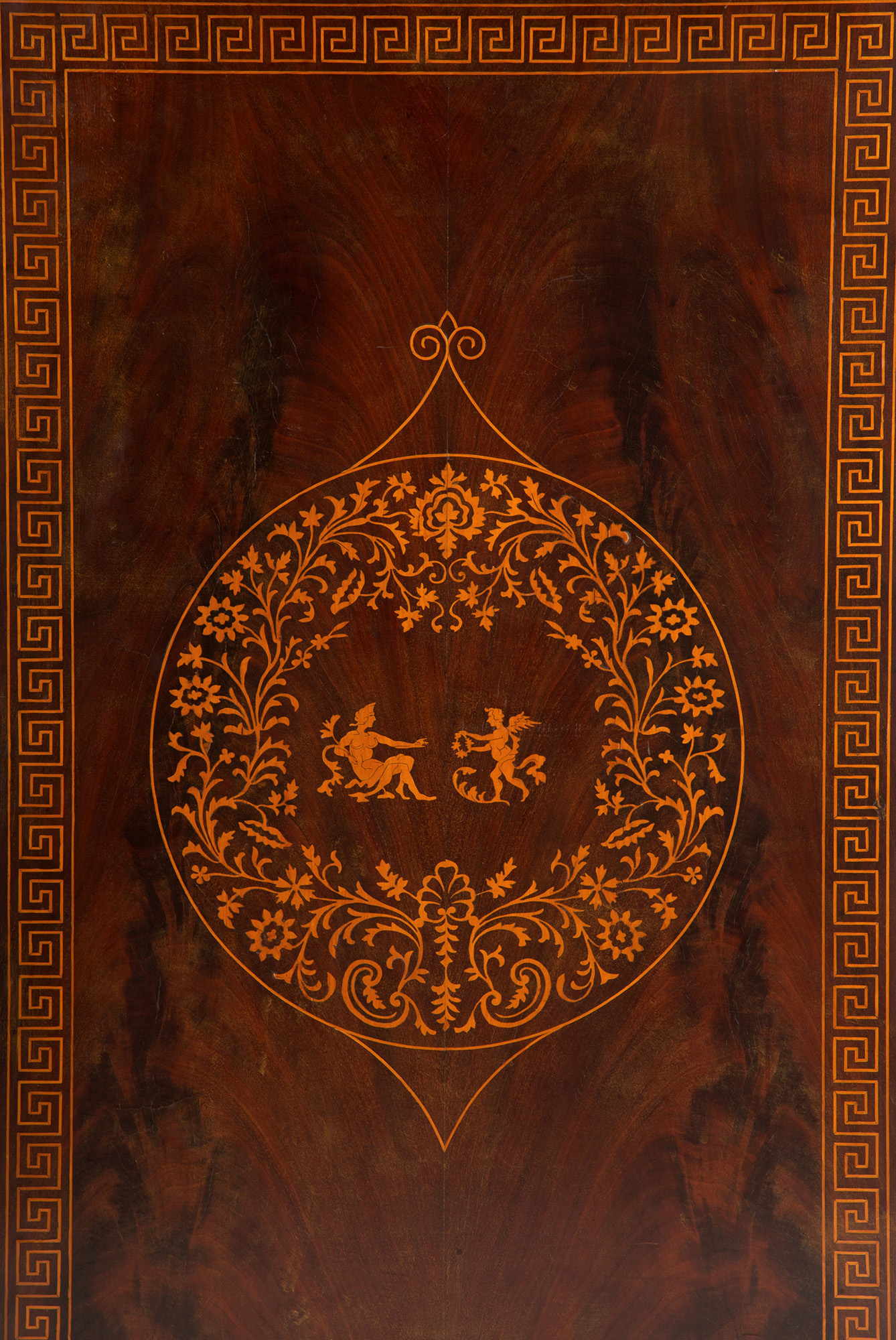 Sideboard veneered in mahogany feather and finely inlaid in maple with Carrara marble top. Charles X period. Defects. 140.5x78.5x48.5 cm approx. Credenza lastronata in piuma di mogano e finemente intarsiata in acero con piano in marmo di Carrara. Periodo Carlo X. Difetti. 140,5x78,5x48,5 cm ca.