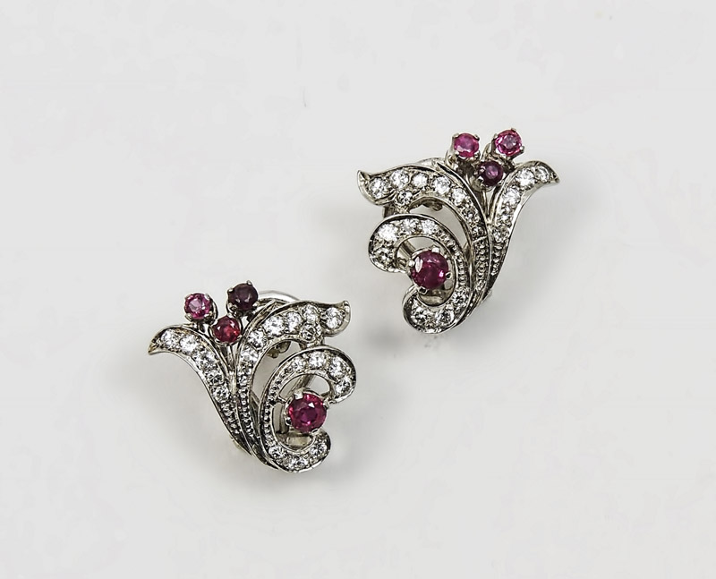PAIO DI ORECCHINI IN ORO BIANCO, RUBINI E DIAMANTI - WHITE GOLD, RUBY AND DIAMOND EARRINGS Anni Sessanta -60s di ispirazione floreale, realizati come tralci di foglie impreziositi da brillanti con piccoli rubini come fiori gr 7,6