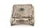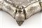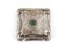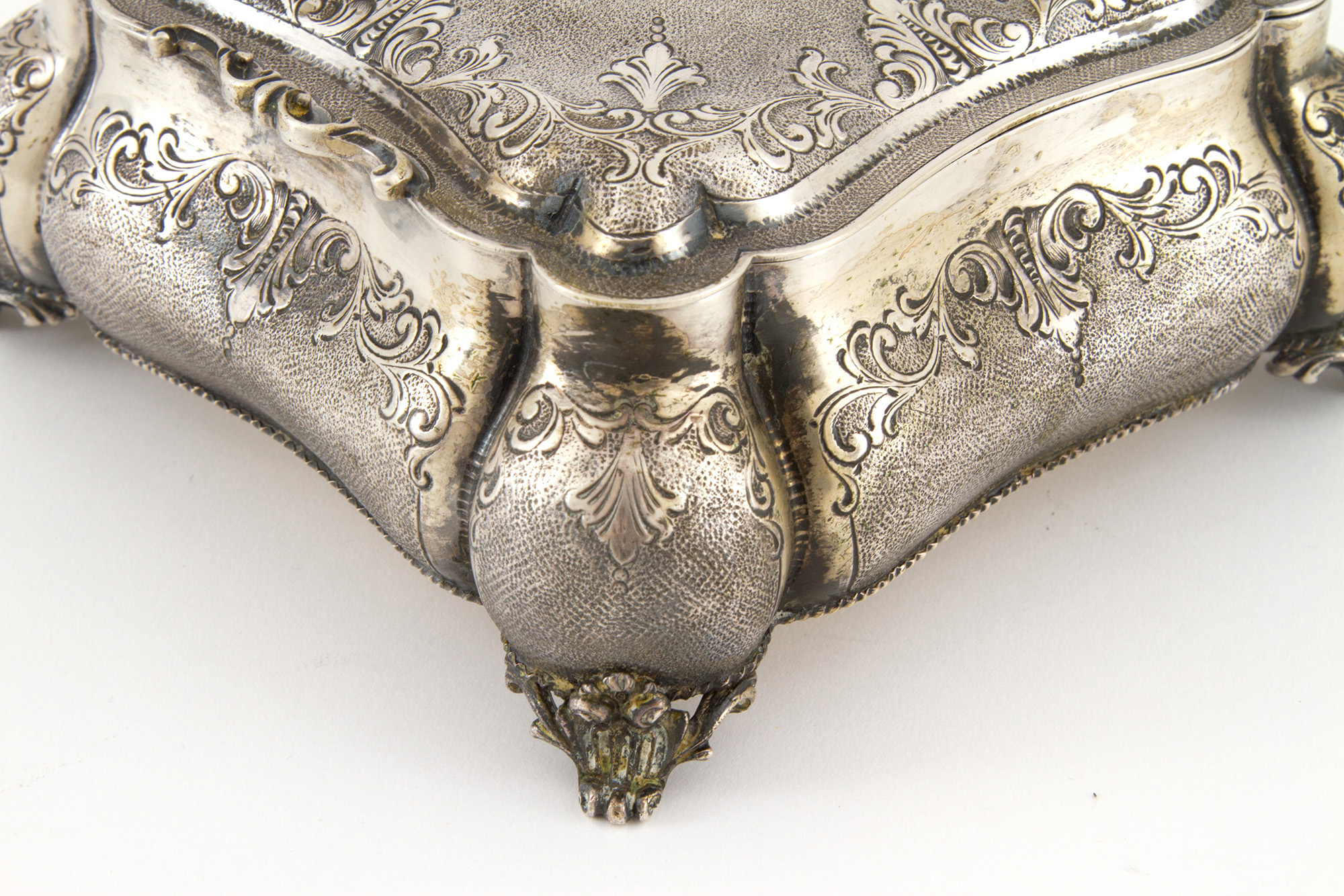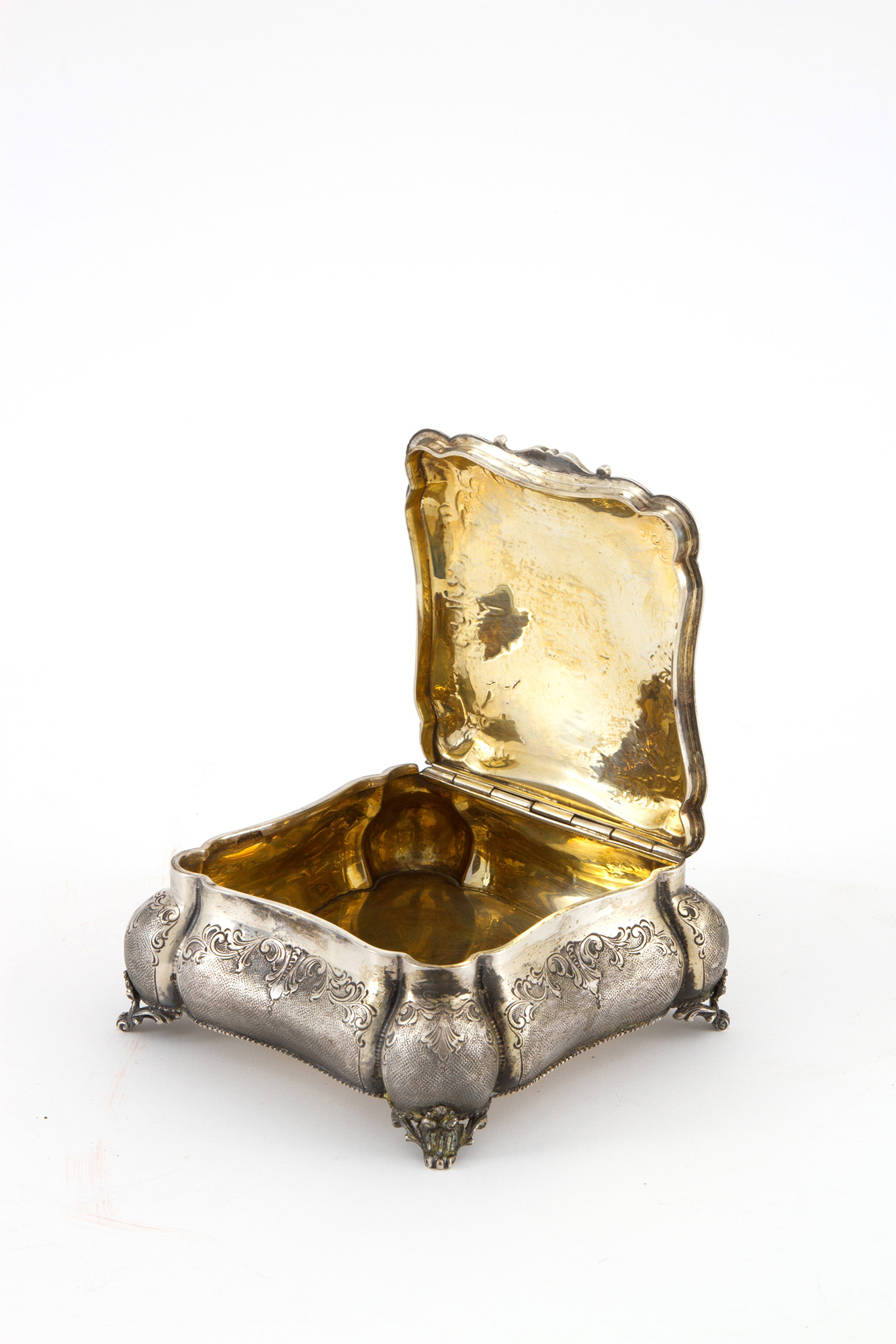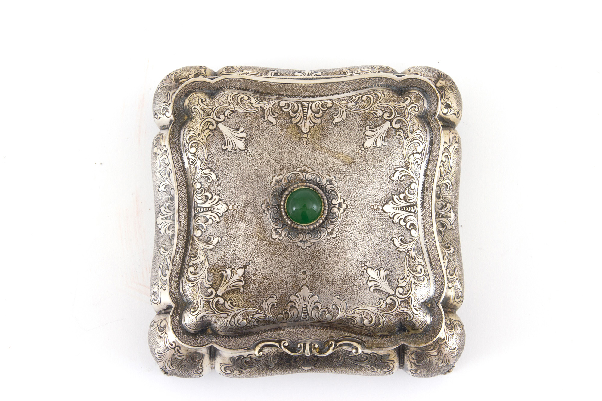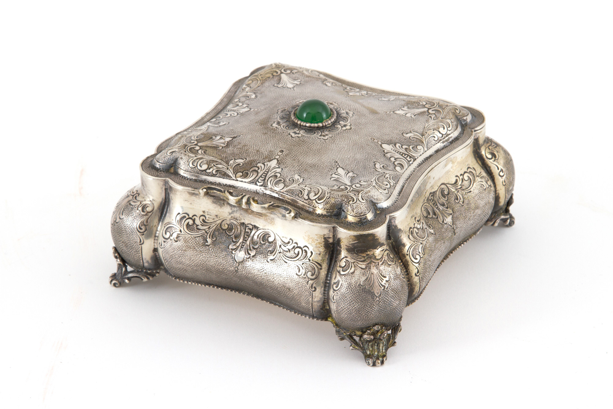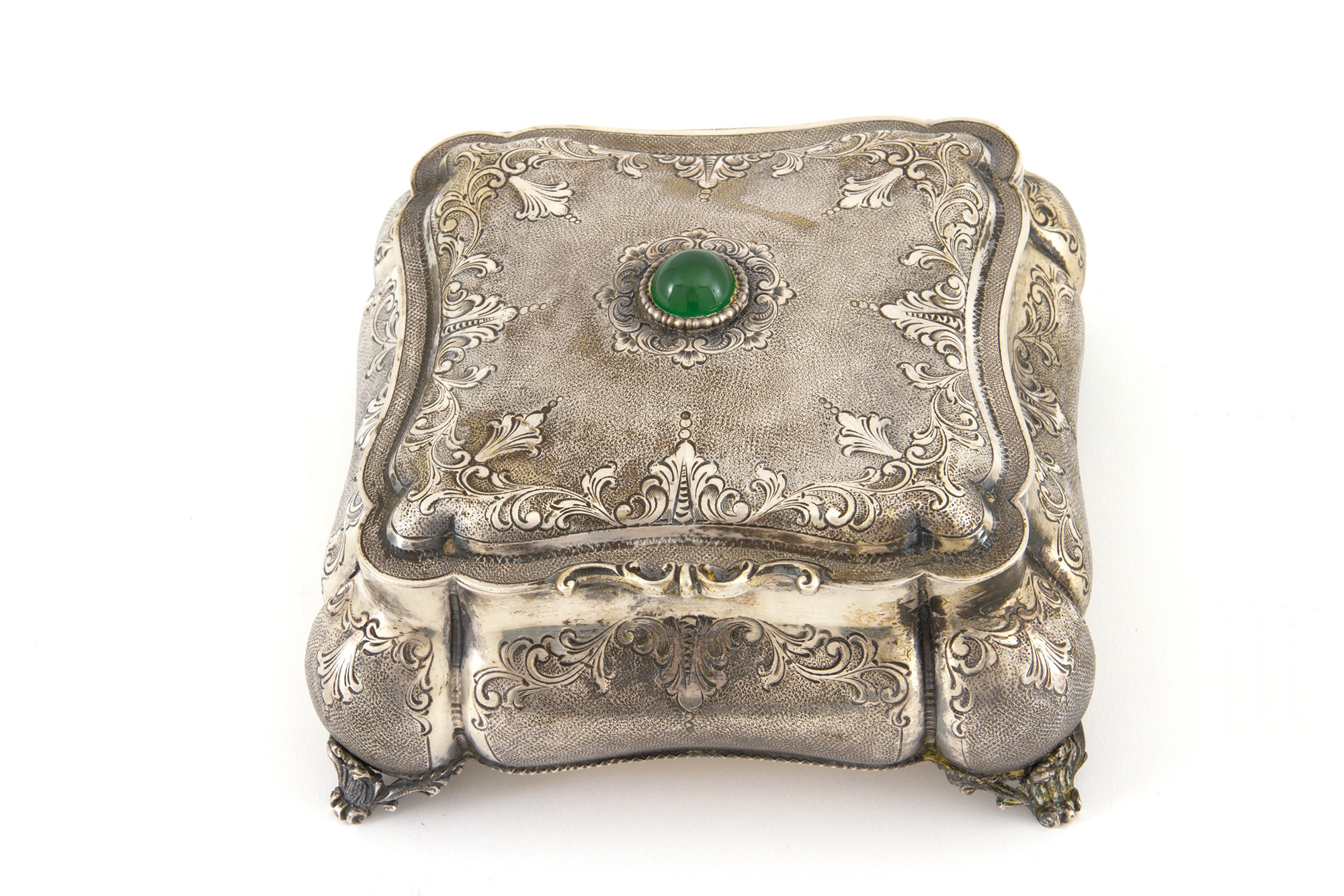 Jewelery box in embossed and finely chiselled 800 silver, gilded inside and with green agate cabochon at the top, gr. 626 ca. 7x14x14 cm approx. Portagioie in argento 800 sbalzato e finemente cesellato, dorato all'interno e con cabochon in agata verde in alto, gr. 626 ca. 7x14x14 cm ca.