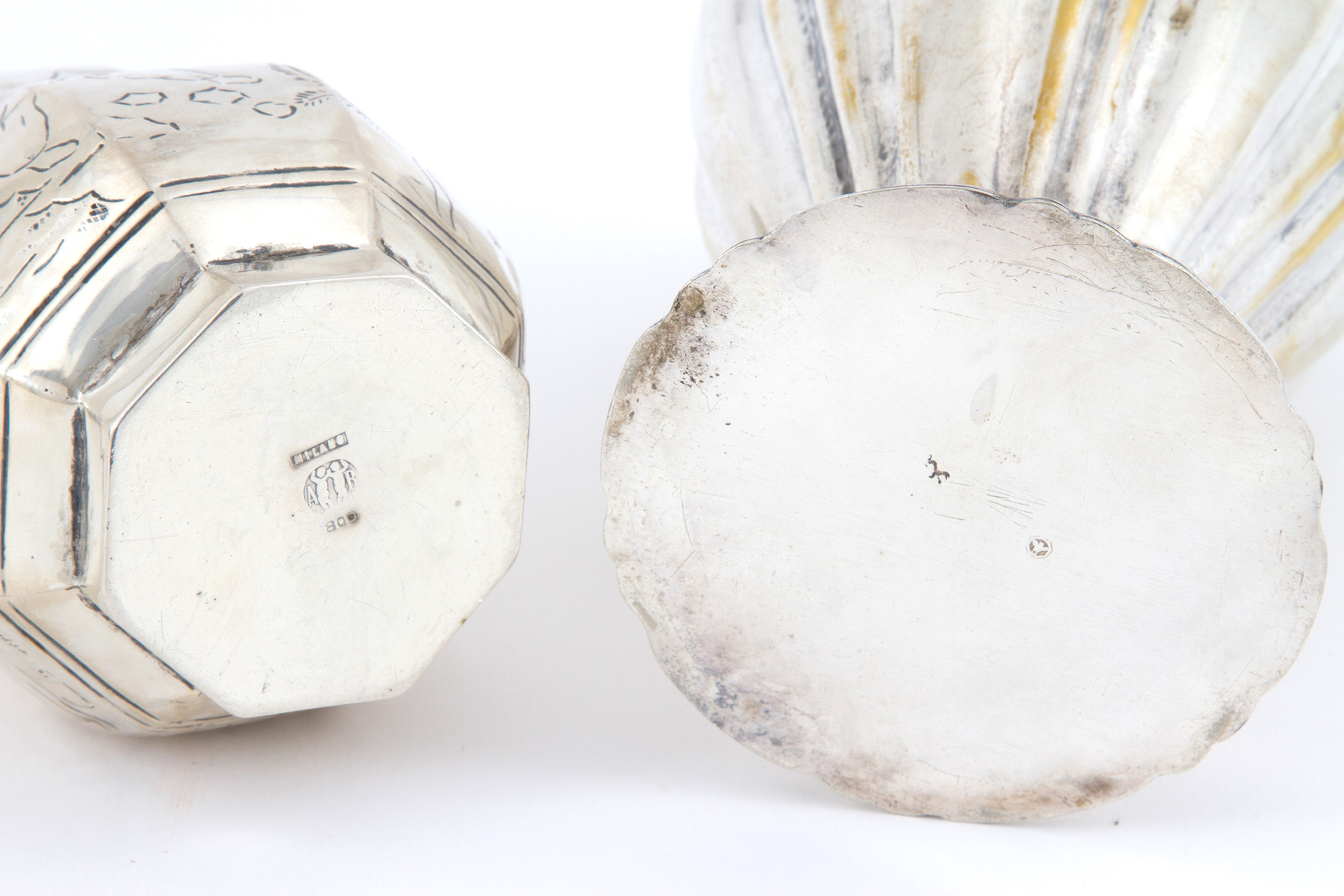 Due vasi in argento 800 sbalzato, gr. 557 ca. complessivi. Punzoni MILANO sul fondo.